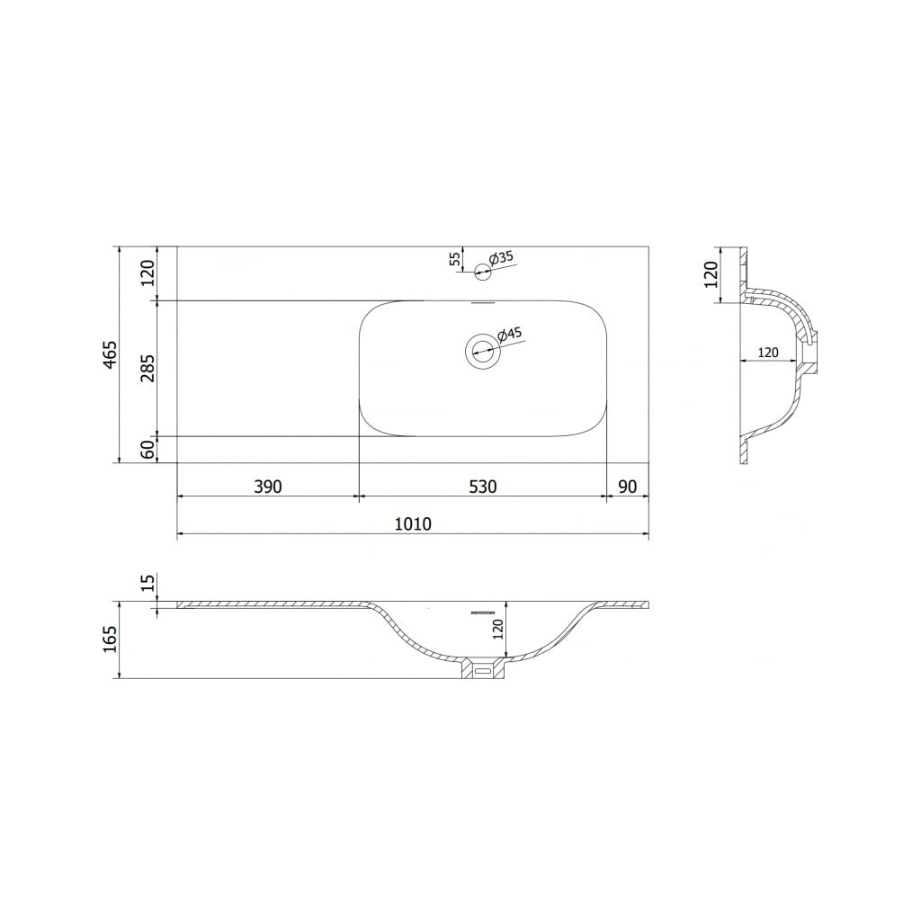 Technické údaje: Rozmery: 101x46,5x16,5 cm Hĺbka: 12 cm Typ: Zapustenie do dosky, pravá strana Farba: Čierna matná Materiál: Konglomerát Prepadový otvor: Áno Otvor na batériu: ÁnoDodatočné parametre