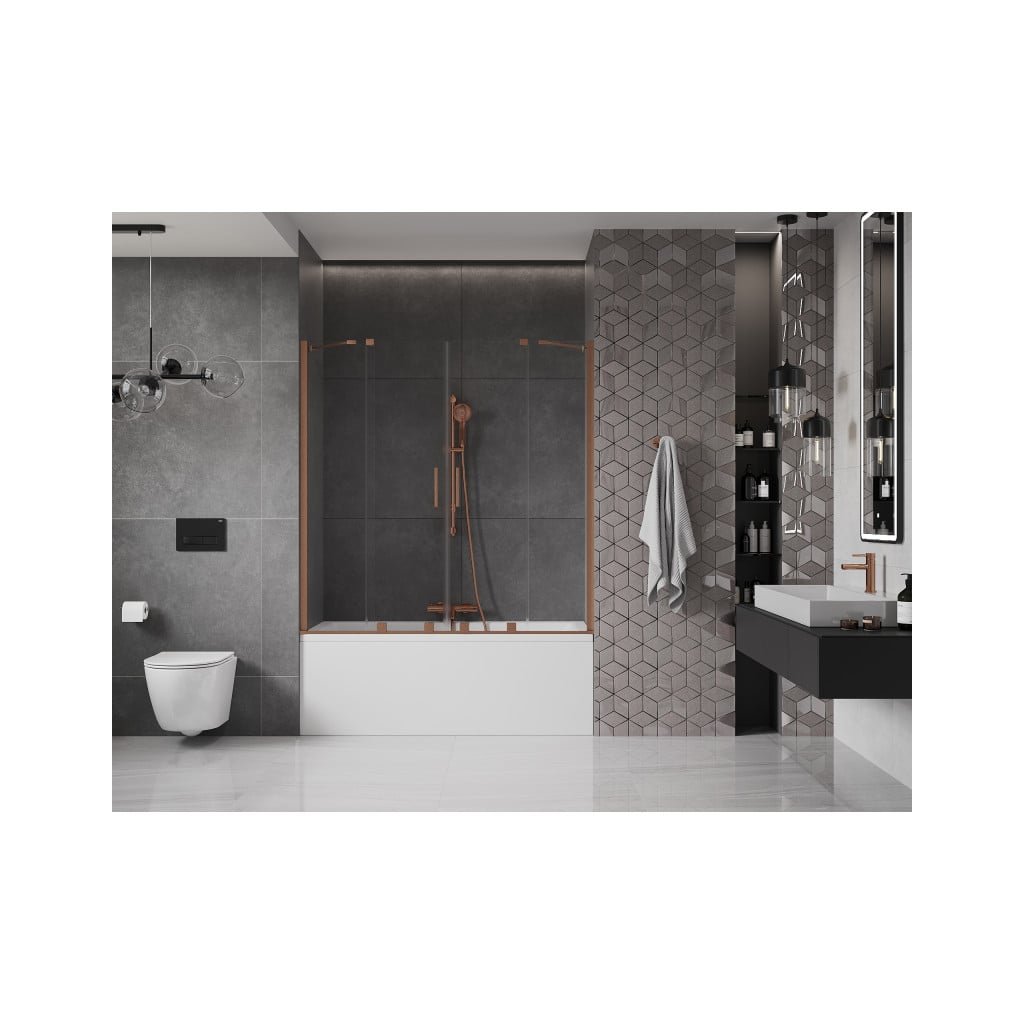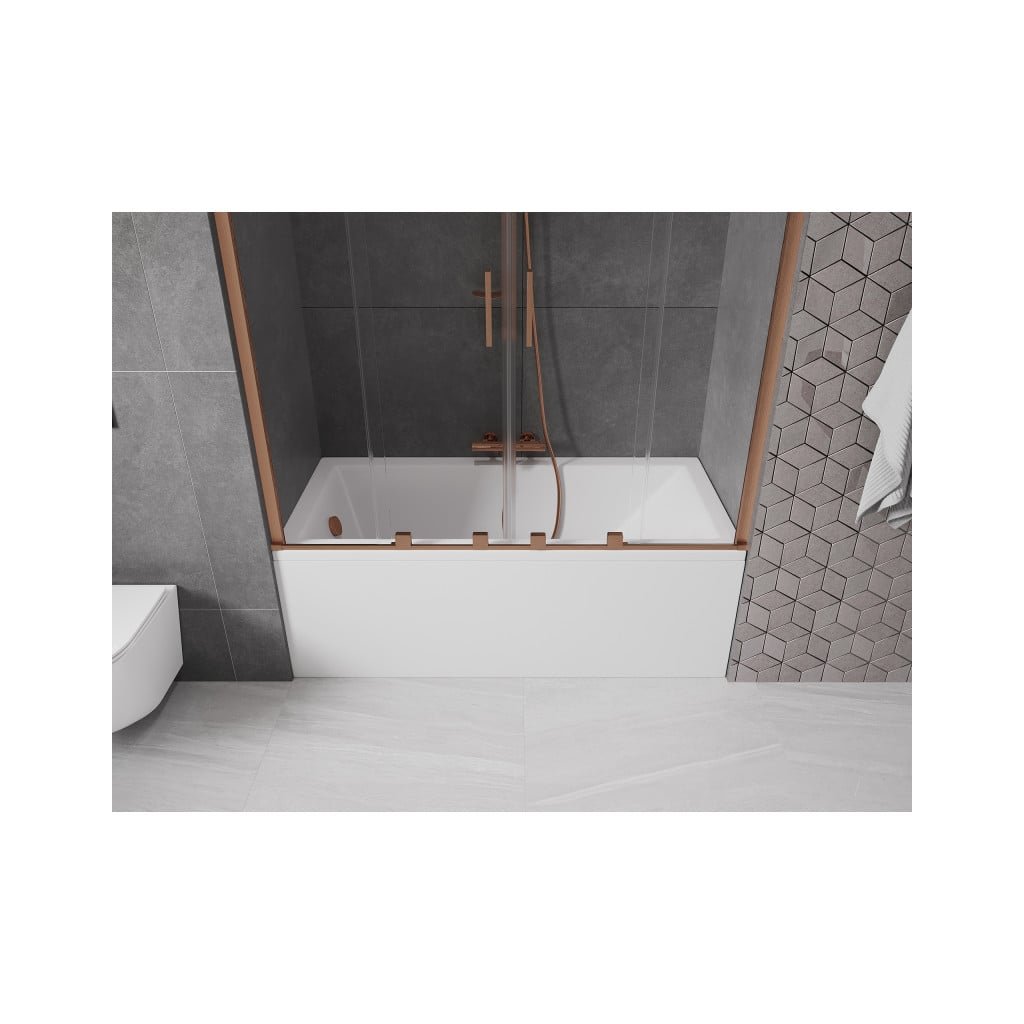 Mexen Velar Duo, 2-krídlová posuvná vaňová zástena 150 x 150 cm, 8mm číre sklo, medený matný profil, 896-150-000-02-65