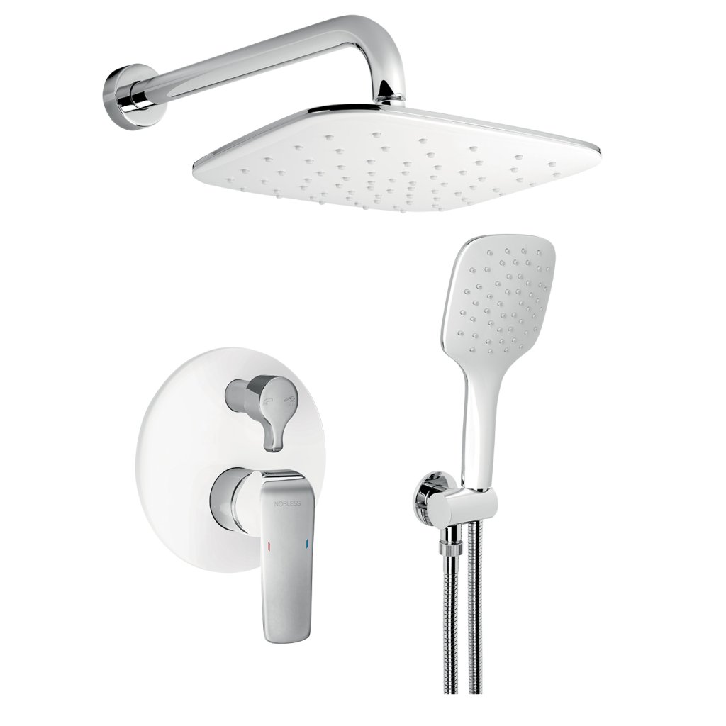 Sprchová podomietková sada s príslušenstvom v prevedení chróm. Sada obsahuje podomietkovú sprchovú batériu s kvalitnou keramickou kartušou s 5 ročnou zárukou a šikovným keramickým prepínačom s podomietkovým pripojením 1/2", kovovú hadicu 150 cm, ramienko zo zdi v dĺžke 350 mm, hlavovú sprchu v rozmere 250 x 250 mm, ručnú sprchu a stenový vývod vody s držiakom na ručnú sprchu.