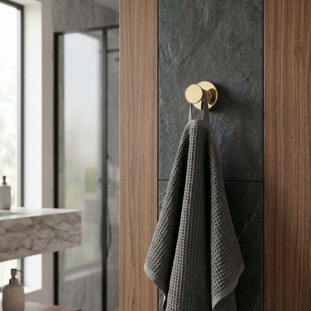 Zlatá lesklá povrchová úprava kovového vešiaka odráža okolité svetlo a vytvára teplú žiaru, ktorá v kúpeľni vizuálne zohrieva priestor. Pri kúpeľňovom svietidle, prirodzenom svetle alebo oboch zdrojoch súčasne zlatý vešiak mení svoju intenzitu odrazu — živý kovový povrch, ktorý nie je statický, ale reaguje na podmienky v miestnosti.