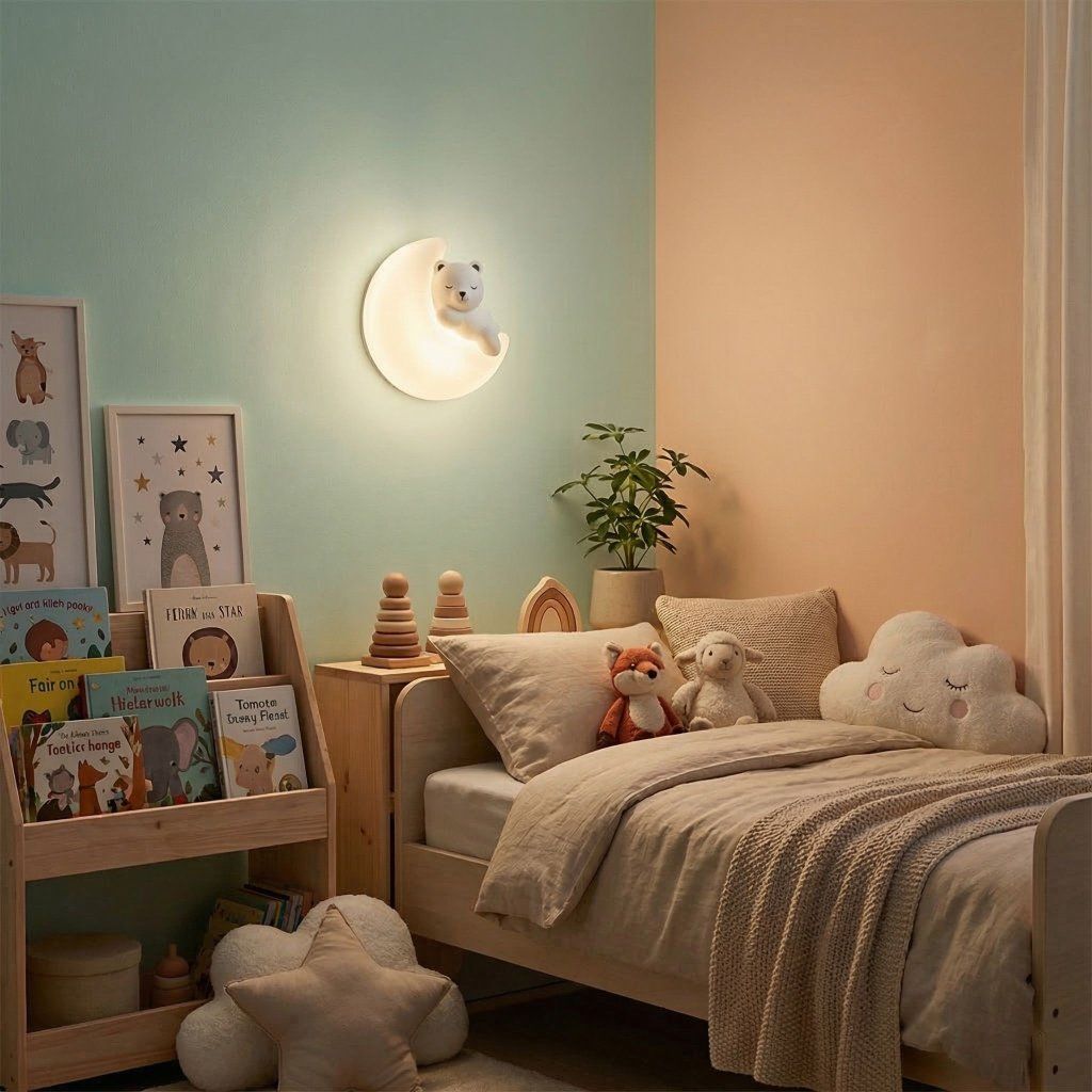 Celá lampa je prevedená v bielej farbe — mesiac, medvedík aj nástenná konzola. Biela je v detskej izbe najuniverzálnejšou voľbou: harmonicky ladí s pastelovo ružovými, mint, žltými aj sivými farebnými konceptmi bez nutnosti špeciálneho zlaďovania. V škandinávskej bielej alebo drevom zaradenej detskej izbe biela lampa splynie s interiérom a do popredia sa dostane len jej tvar a príbeh.