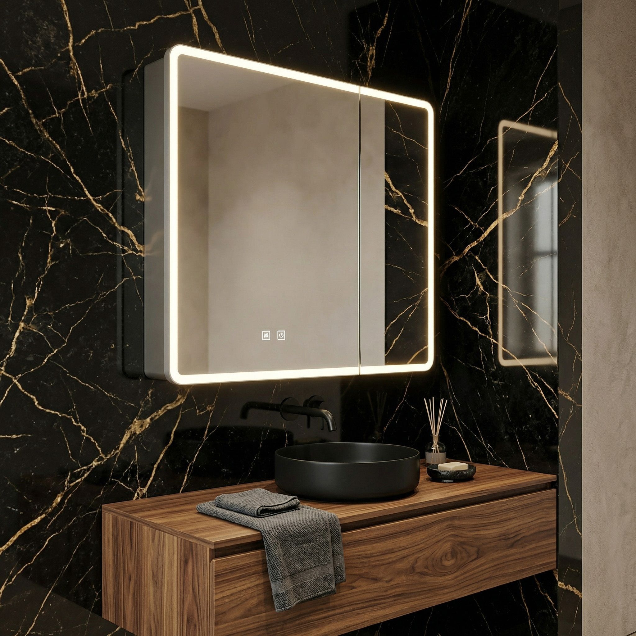 Zabudovaná vykurovacia podložka aktivovaná dotykovým senzorom priamo v zrkadle účinne zabraňuje zahmlievaniu tabule aj počas horúceho kúpania. Druhý senzor ovláda LED osvetlenie — oba sú nenápadne integrované priamo do plochy zrkadlovej tabule, bez viditeľných tlačidiel narúšajúcich čistotu dizajnu.