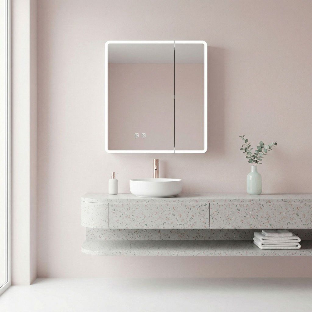 Zrkadlová skrinka spája minimalistický dizajn s premyslenou funkčnosťou. Telo skrinky je zámerné menšie ako obvod zrkadlovej tabule, čo vytvára unikátny vizuálny efekt — zrkadlo akoby „levitovalo" pred stenou. Bielo-sivá farebná kombinácia tela ladí s chladným odtieňom zrkadlovej tabule aj modernou kúpeľňovou armatúrou.