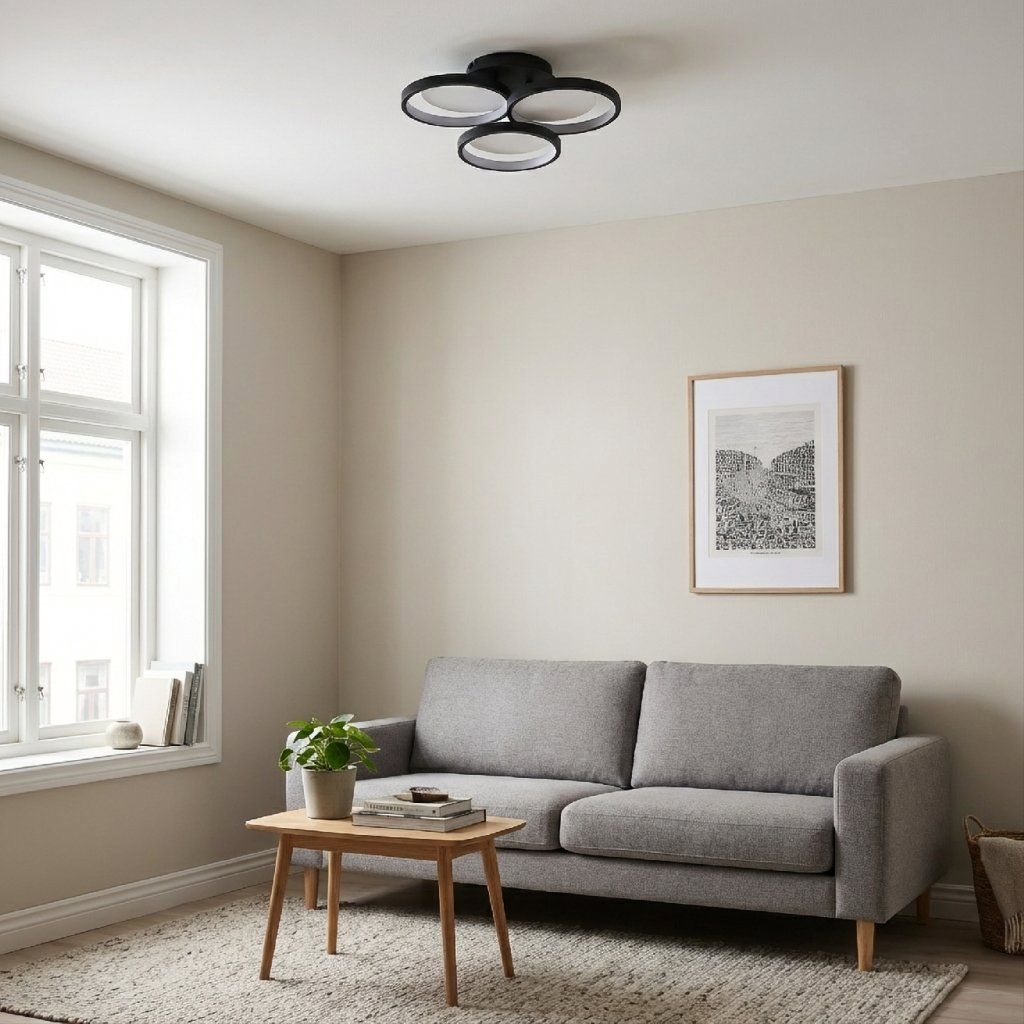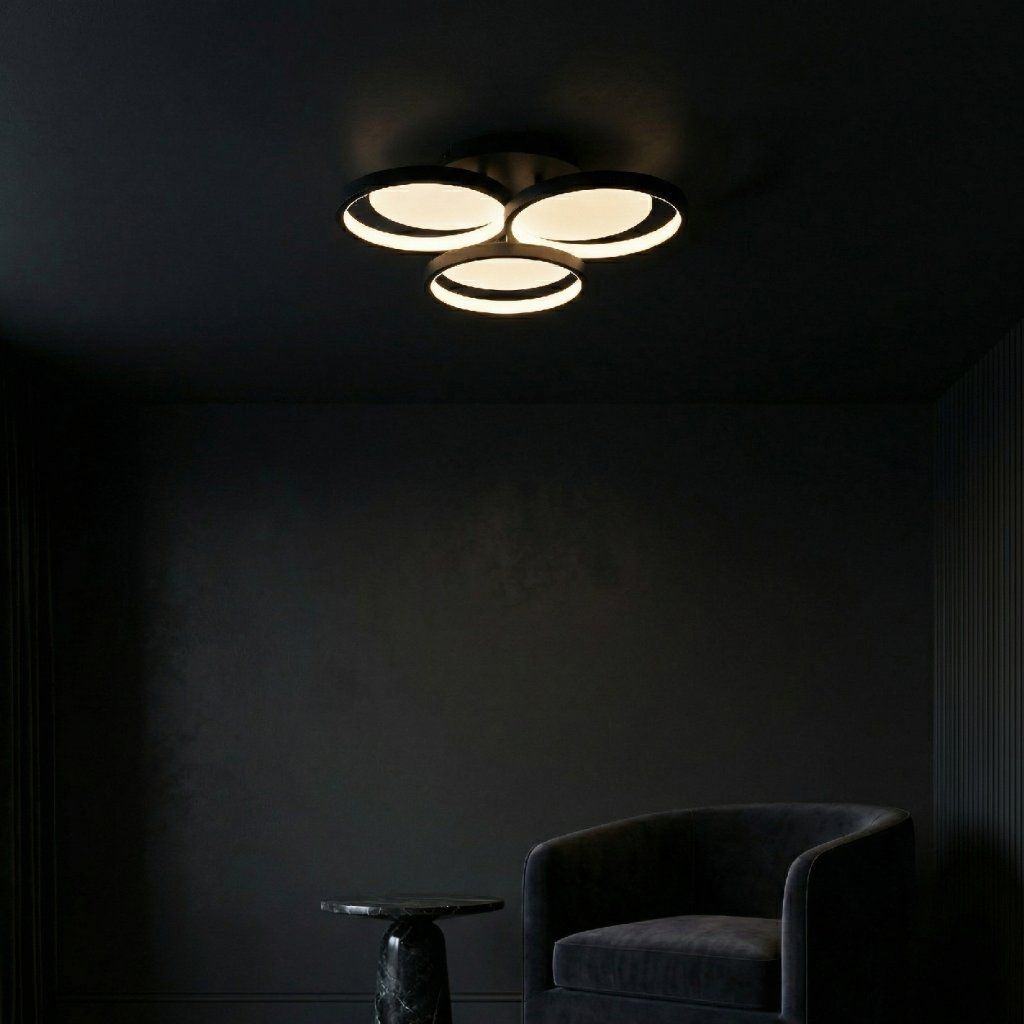 Stropné svietidlo s modernou, kompaktnou formou je štýlovou voľbou do minimalistických a moderných interiérov. Kompozícia troch kruhov rôznych veľkostí vytvára ucelené dekoratívne usporiadanie, ktoré priťahuje pohľady a dodáva aranžmánu geometrický charakter. Čierna farebnosť podčiarkuje eleganciu a zabezpečuje, že model skvele zapadne do aktuálnych trendov. Prisadená konštrukcia pri strope pôsobí ľahko a esteticky a zároveň sa výborne hodí do miestností, kde je dôležité pohodlné, dobre naplánované osvetlenie. Integrovaný LED zdroj poskytuje rovnomerné, komfortné svetlo ideálne na každodenné používanie. Je to spojenie funkčnosti a moderného dizajnu – ideálne do obývačky, spálne, kuchyne, predsiene aj kancelárskych priestorov, kde je dôležitá estetika aj praktické osvetlenie.Dodatočné parametre