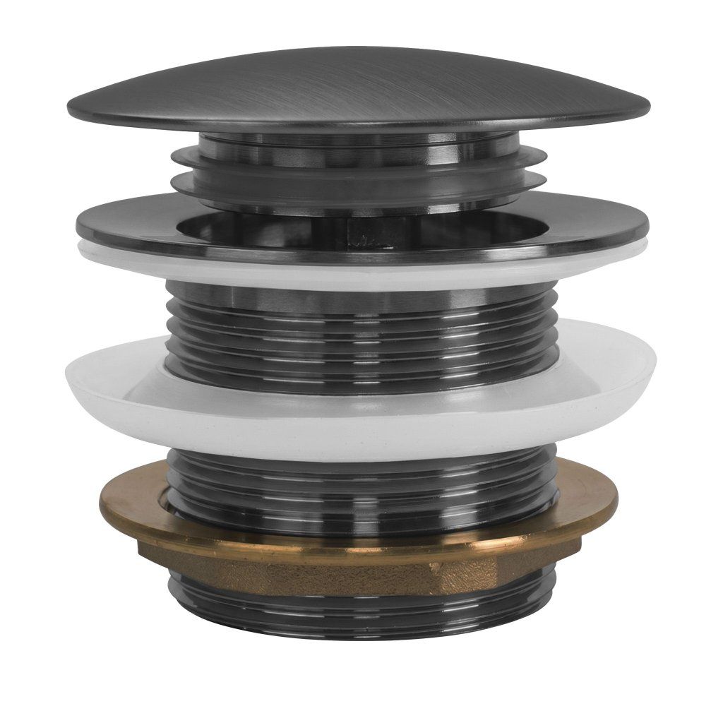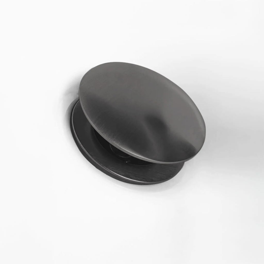 Vaňový výpust Click-Clack v grafitovej povrchovej úprave je vyrobený z masívnej mosadze a završuje kúpaciu zónu s hlbokým, saténovým odtieňom tmavosivej farby. Je to dizajnový prvok, ktorý dokonale ladí s armatúrou v rovnakom prevedení.
