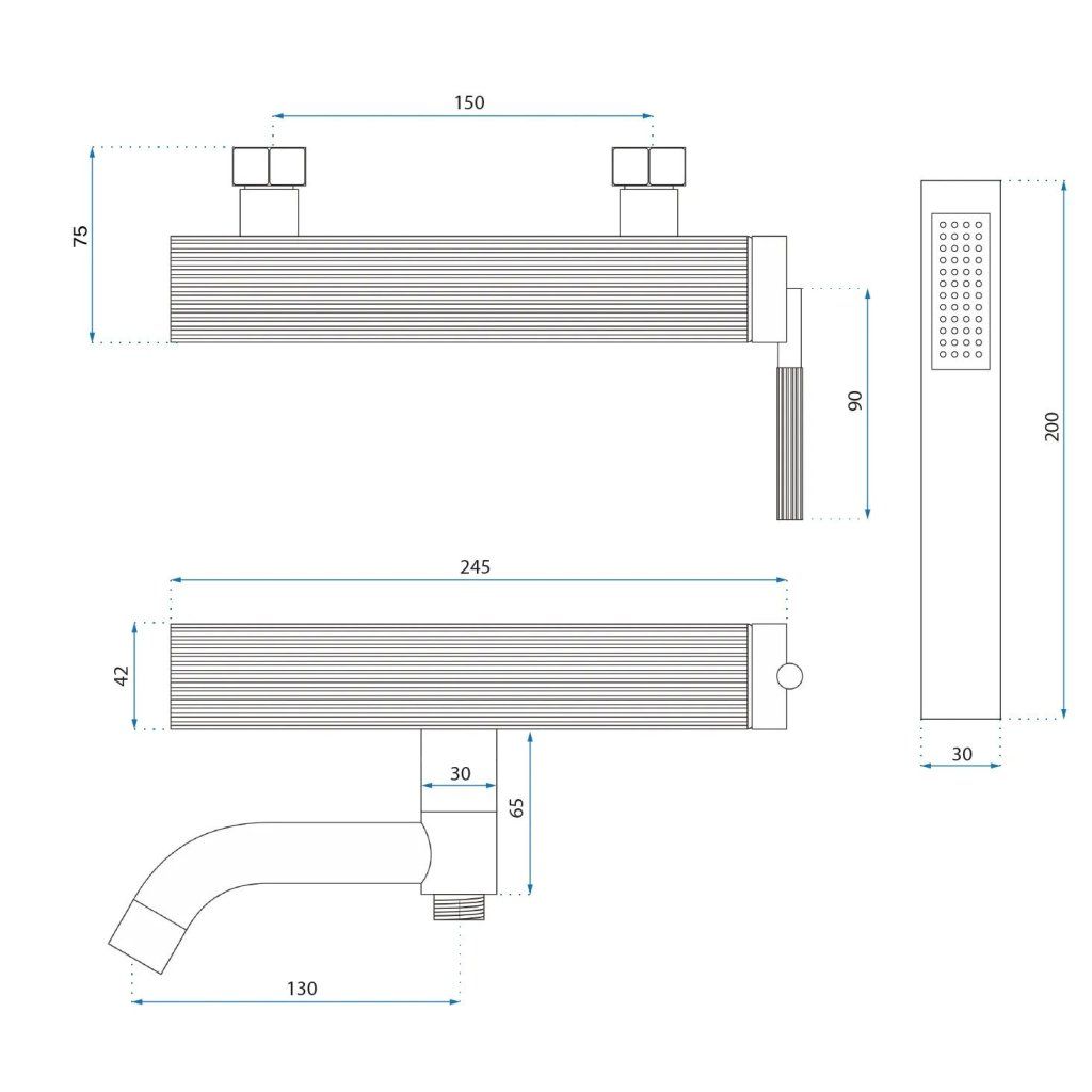 - Obsah súpravy: Batéria, sprchová hadica 150cm, ručná sprchová hlavica, nástenný bodový držiak sprchovej hlavica, vačky, mriežky