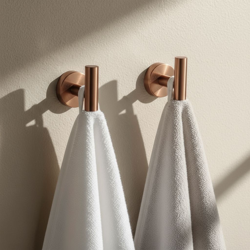 Všetky prvky sú vyrobené z vysoko kvalitného kovu, odolného voči vlhkosti a korózii. Povrch v odtieni brúsená meď dodáva eleganciu a jedinečný charakter, pričom zostáva odolný voči stopám každodenného používania. Doplnky sú montované na stenu, čo zaručuje stabilitu, trvácnosť a pohodlie.