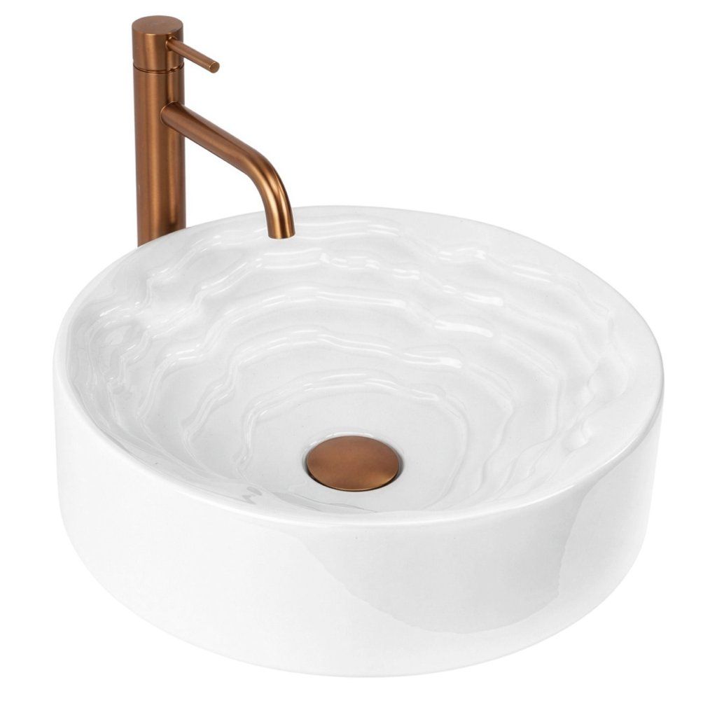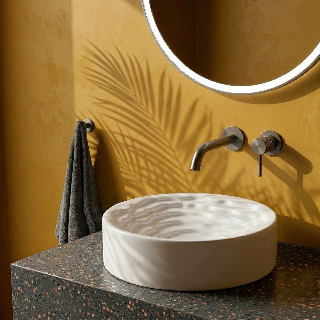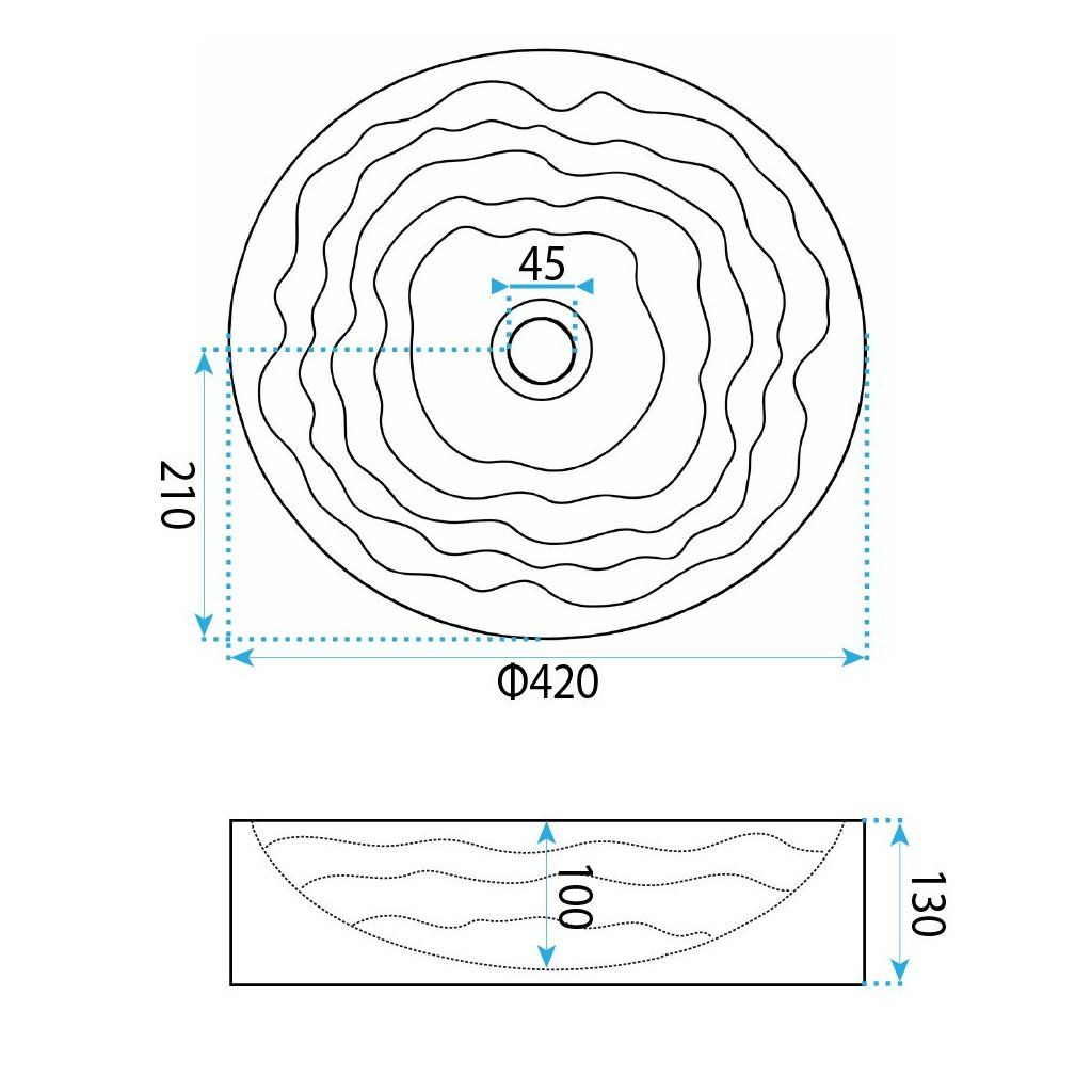 Umývadlo je navrhnuté na montáž na dosku alebo skrinku — pôdorys 420 × 420 mm, výška 130 mm a hĺbka misy 100 mm. Batéria sa inštaluje samostatne na stenu alebo dosku. Okrúhly tvar sa rovnako dobre kombinuje s hranatou aj oblou skrinkou pod umývadlo.