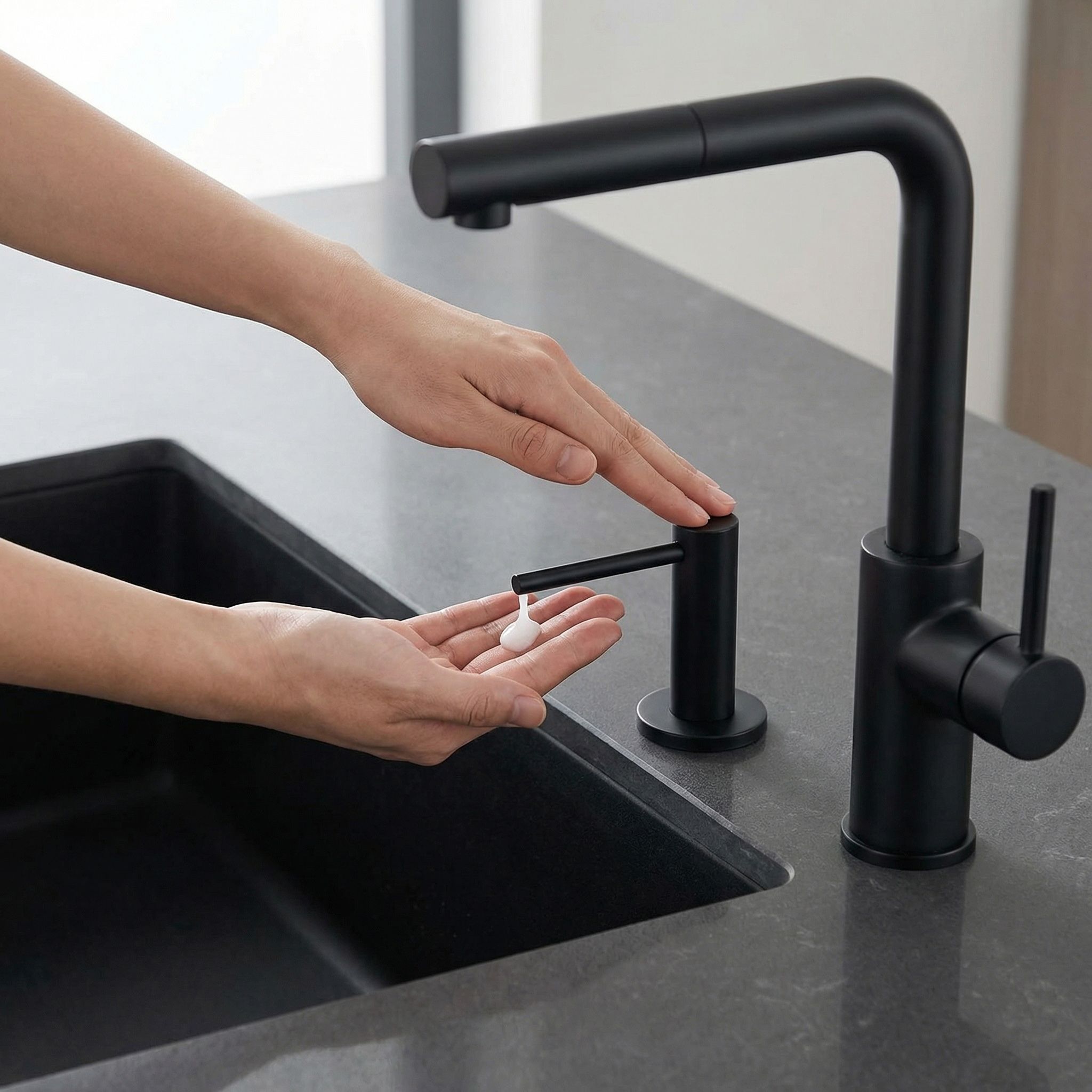 Montáž priamo do otvoru drezu alebo pracovnej dosky navždy eliminuje neestetické fľaše saponátu na linke. Celá umývacia zóna bude pôsobiť čisto, usporiadane a so štýlom — tak, ako to má byť v modernej kuchyni.