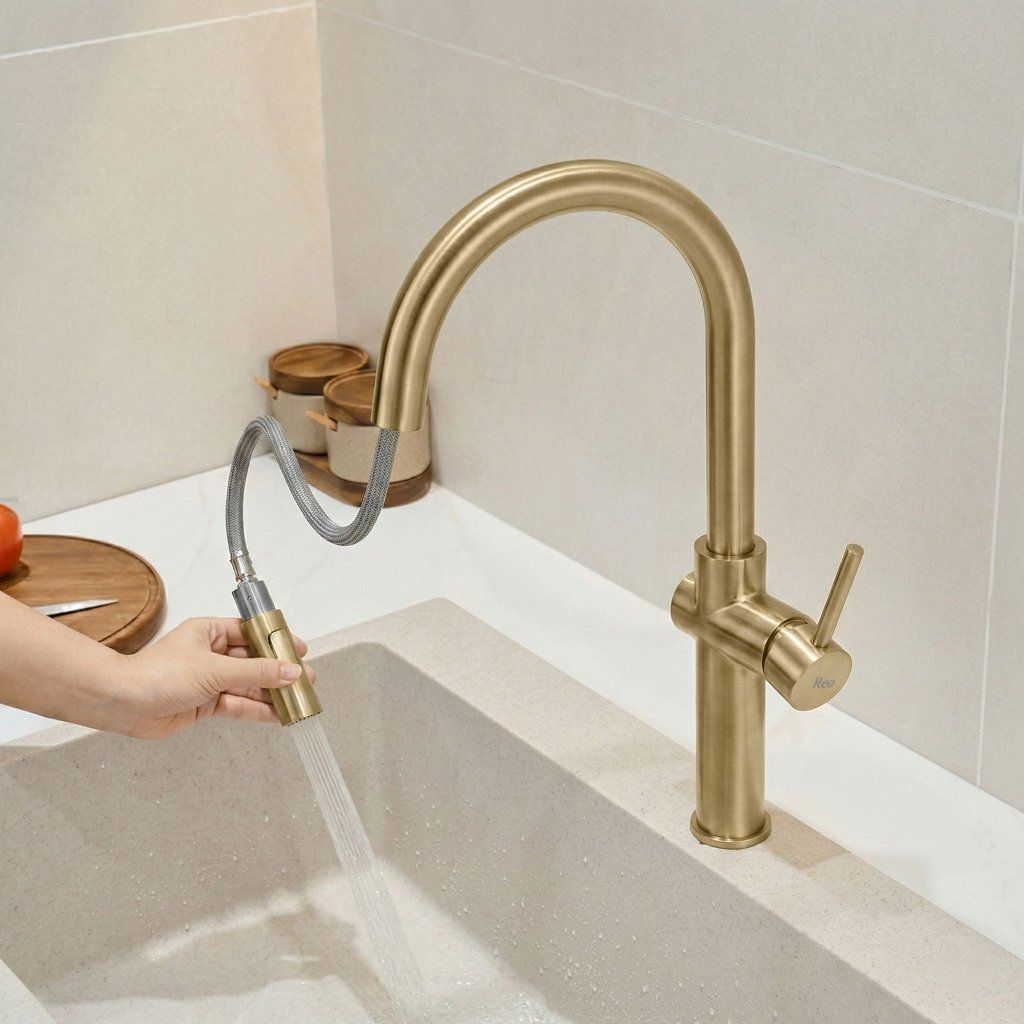 Rea Fresh High, vysoká kuchynská batéria s výsuvnou spŕškou, zlatá matná, REA-B7201