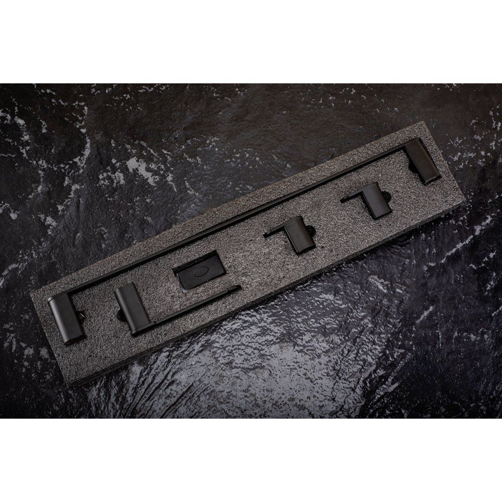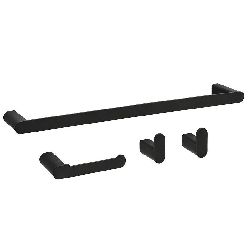 Súprava obsahuje všetko potrebné pre praktické a estetické vybavenie kúpeľne – podlhovastý držiak na uterák, držiak na toaletný papier a dva háčiky. Všetky prvky sú navrhnuté tak, aby spolu vizuálne harmonizovali.