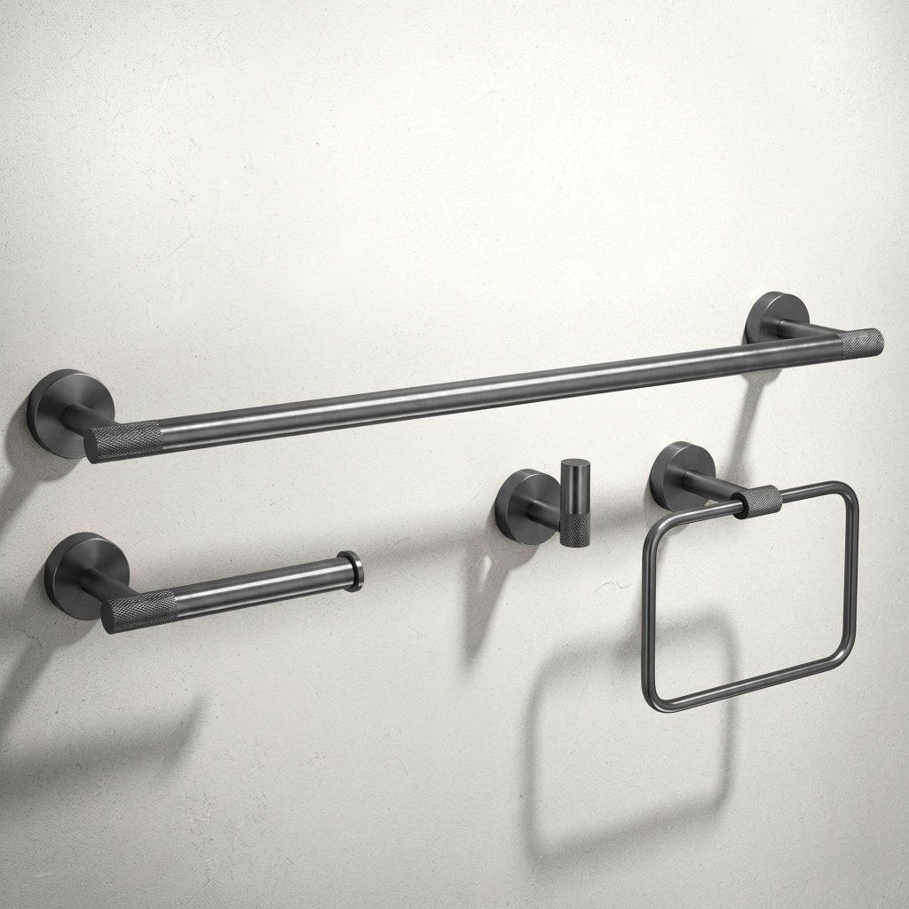 Sada kúpeľňových doplnkov Grid je elegantné a funkčné riešenie, ktoré sa dokonale hodí do každej modernej kúpeľne. Súčasťou sady je držiak na veľký uterák, držiak na toaletný papier, háčik a kruh na uterák – kompletný štýlový celok pre každodenné použitie.