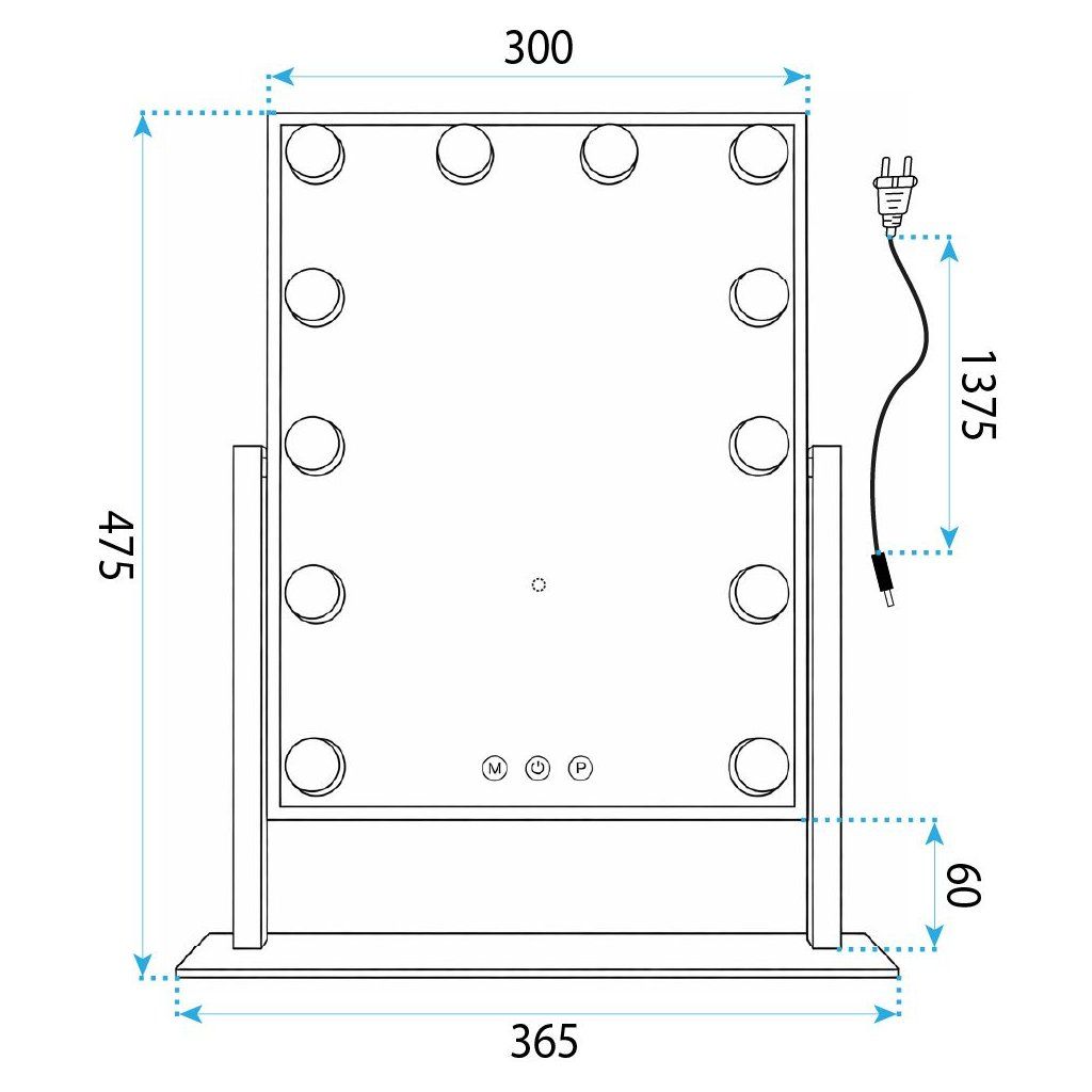 Zvislá orientácia zrkadla zaberá na toaletnom stolíku minimum šírky — pri šírke len 300 mm sa Style White zmestí aj na menší stolík alebo poličku, kde širší Hollywood model (580 × 450 mm) by bol príliš dominantný.
