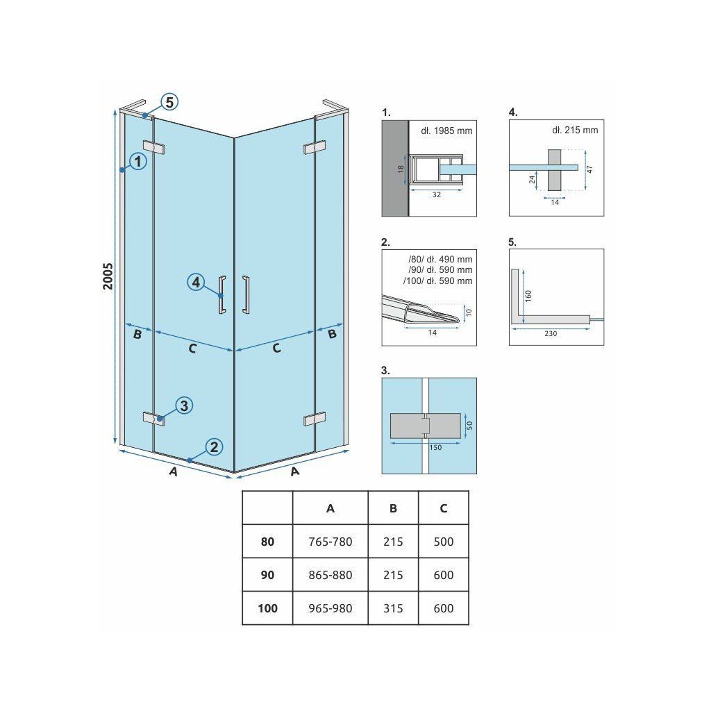 - Rozmery: 800 mm (dvere) x 800 mm (dvere) x 2005 mm (výška)
