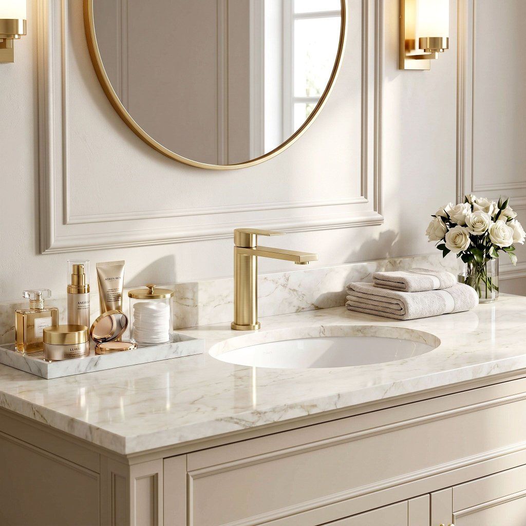 Saténový odtieň kartáčovaného zlata účinne potláča viditeľnosť škvŕn od vody a odtlačkov prstov — kúpeľňa zostáva reprezentatívna aj bez každodenného leštenia.