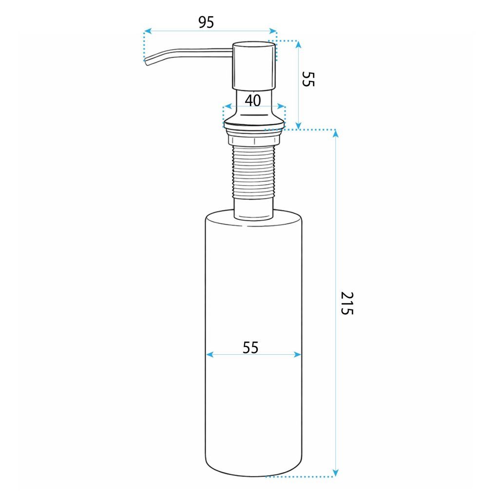 Celkové rozmery 95 × 55 × 55 mm zaručujú, že dávkovač nezaberie zbytočne veľa priestoru ani v skrinke pod drezom ani na pracovnej doske drezu. Inštalácia je jednoduchá a nevyžaduje špeciálne nástroje.