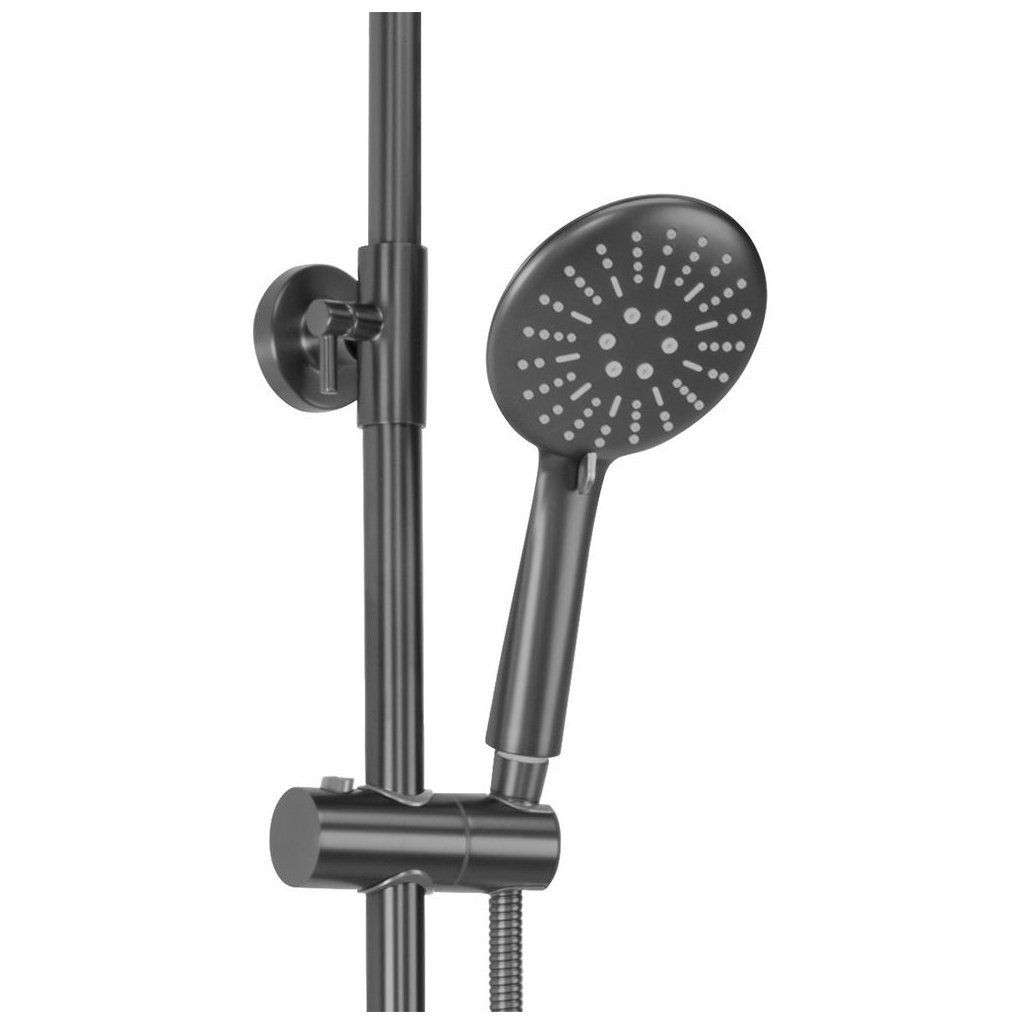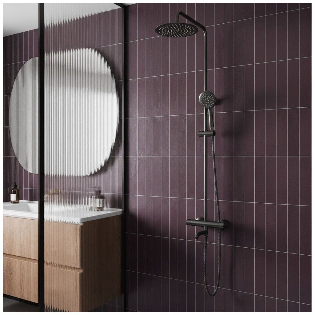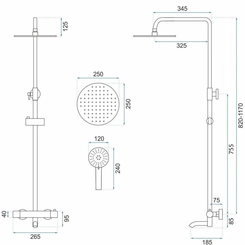 - Zloženie sprchovej súpravy: Termostatická batéria s vaňovým výtokom, sprchová hadica s ručnou sprchovou hlavicou, nerezová dažďová hlavová sprcha