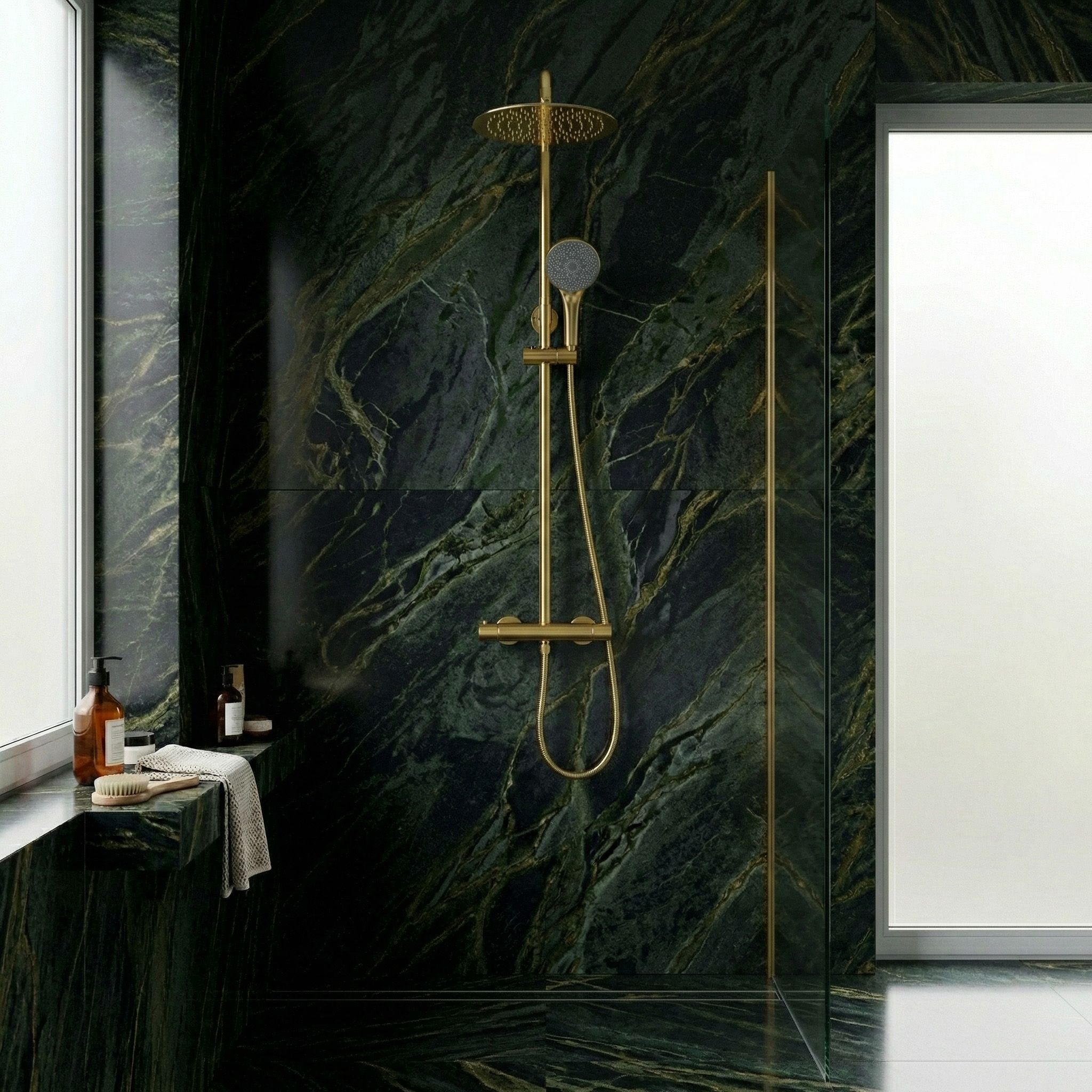 Súčasťou setu je veľká ultra-tenká dažďová hlavica pre luxusný, rovnomerný prúd vody a dopasovaná ručná sprchová hlavica. Oba prvky sú v zlatom prevedení a tvoria harmonickú, esteticky dokonalú zostavu sprchového kúta. Výška systému je plne nastaviteľná v rozsahu 845–1205 mm.