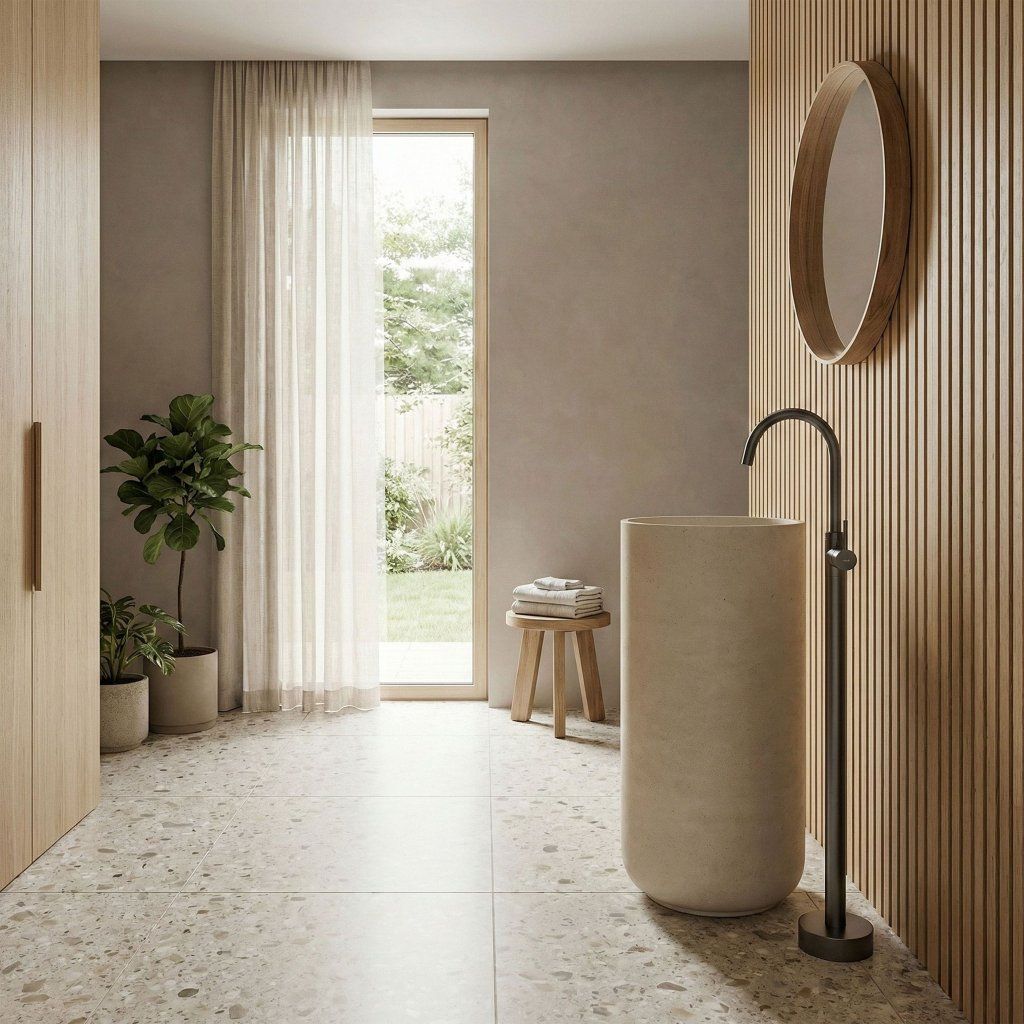 Podlahová inštalácia je ideálnym riešením pre dizajnové kúpeľne s umývadlom na dosku alebo voľne stojacím umývadlom. Batéria sa stáva výrazným estetickým prvkom interiéru.