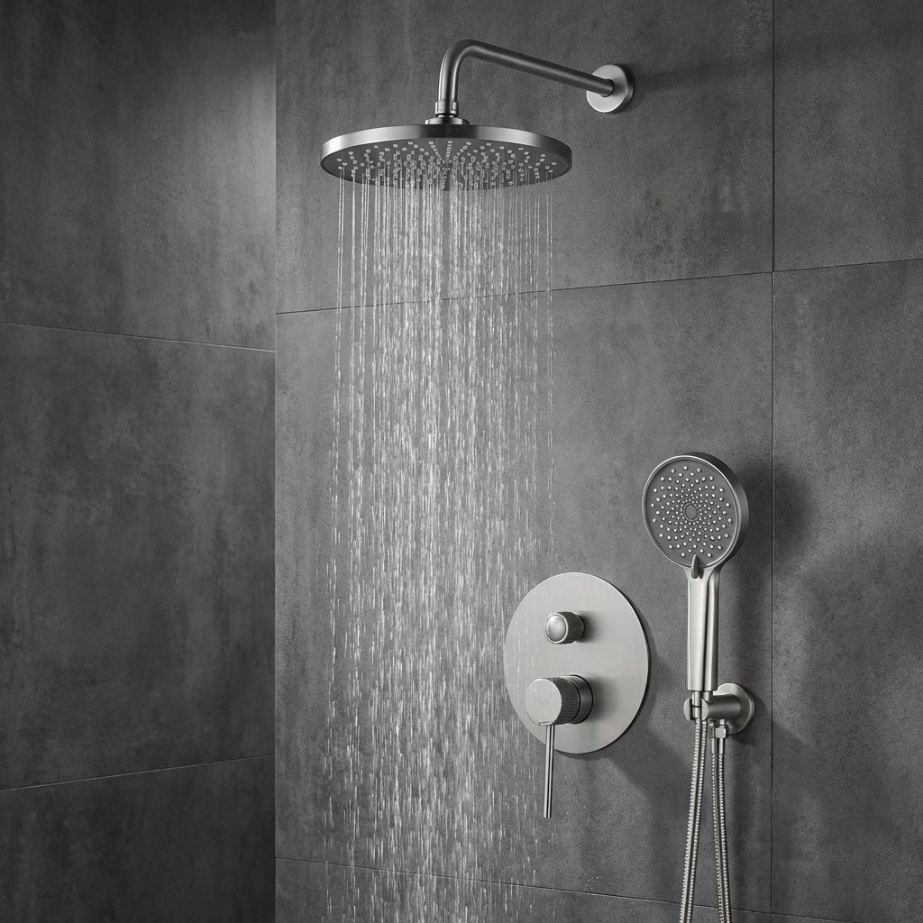 Plochá okrúhla hlavová sprcha na nástennom ramene poskytuje príjemný a relaxačný prúd vody. Súpravu dopĺňa ergonomická ručná sprcha s flexibilnou hadicou.