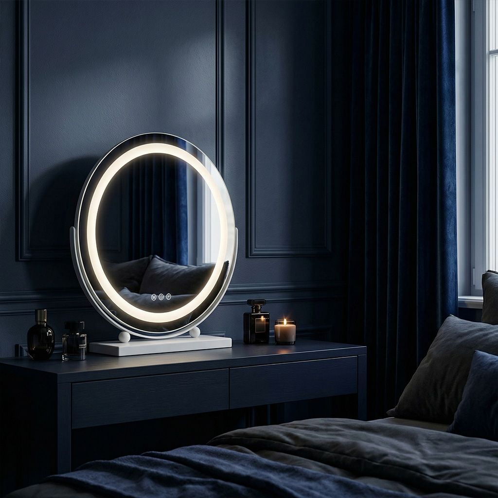 Stojanová konštrukcia nevyžaduje žiadnu montáž — stačí zrkadlo postaviť a zapojiť. Biela farba prirodzene ladí s bielymi, béžovými aj drevenými kúpeľňovými a spálňovými interiérmi. Tri farby svetla zaručia profesionálne podmienky pre každý typ líčenia — od ľahkého denného make-upu až po večerný look.