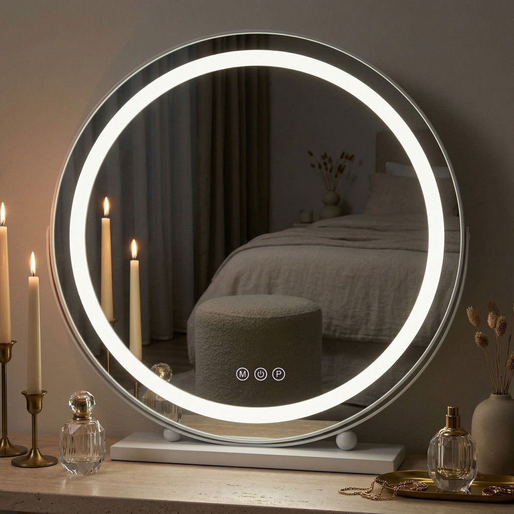 Integrované LED osvetlenie ponúka tri prepínateľné farebné teploty, ktoré pokrývajú celý rozsah bežných podmienok líčenia. Teplá biela simuluje večerné interiérové osvetlenie — ideálna pre večerný make-up. Neutrálna biela zodpovedá dennému svetlu — najvhodnejšia pre každodenné líčenie s verným podaním farieb. Studená biela napodobňuje prirodzené severské denné svetlo — vhodná pre korekčný make-up a detailnú prácu s kontúrami.