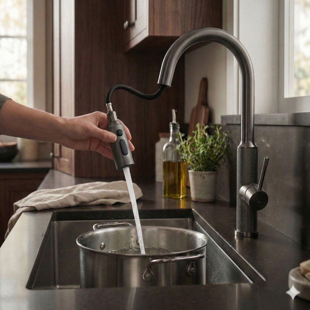 Výtok na flexibilnej hadici umožňuje jednoduché oplachovanie riadu, čistenie drezu alebo napĺňanie veľkých nádob priamo na pracovnej doske.