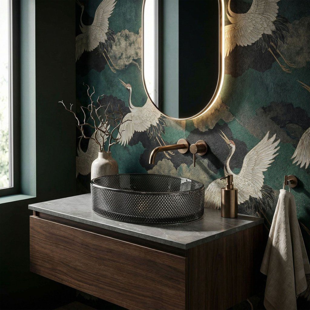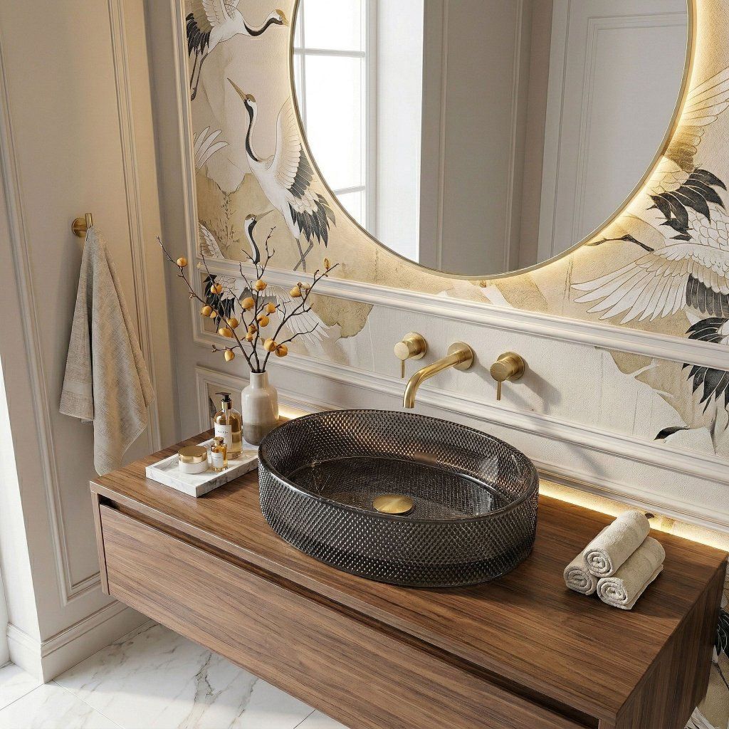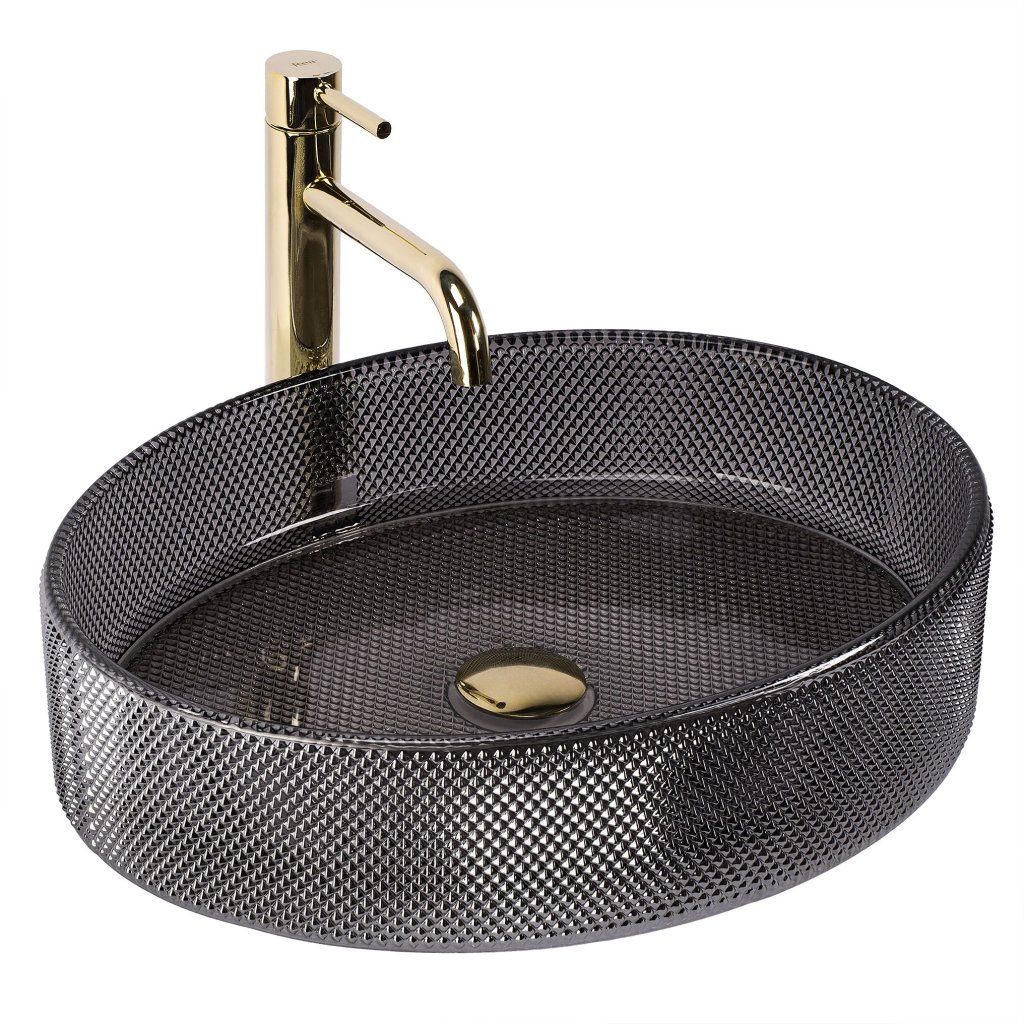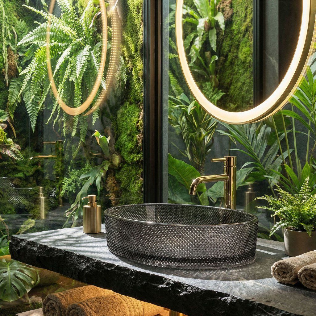 Montáž na dosku alebo skrinku vystaví celý fazetový plášť misy voľne do priestoru — sklenená textúra nie je skrytá, ale prezentovaná ako šperková vitrína. Batéria sa inštaluje samostatne na stenu alebo dosku vedľa umývadla.