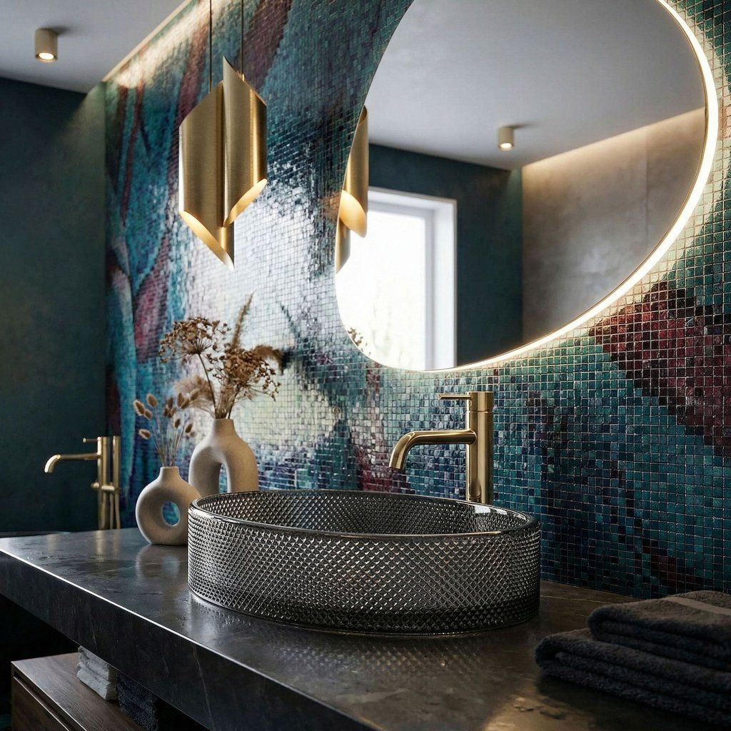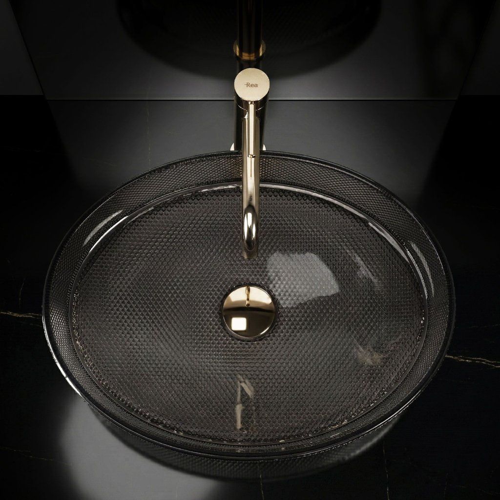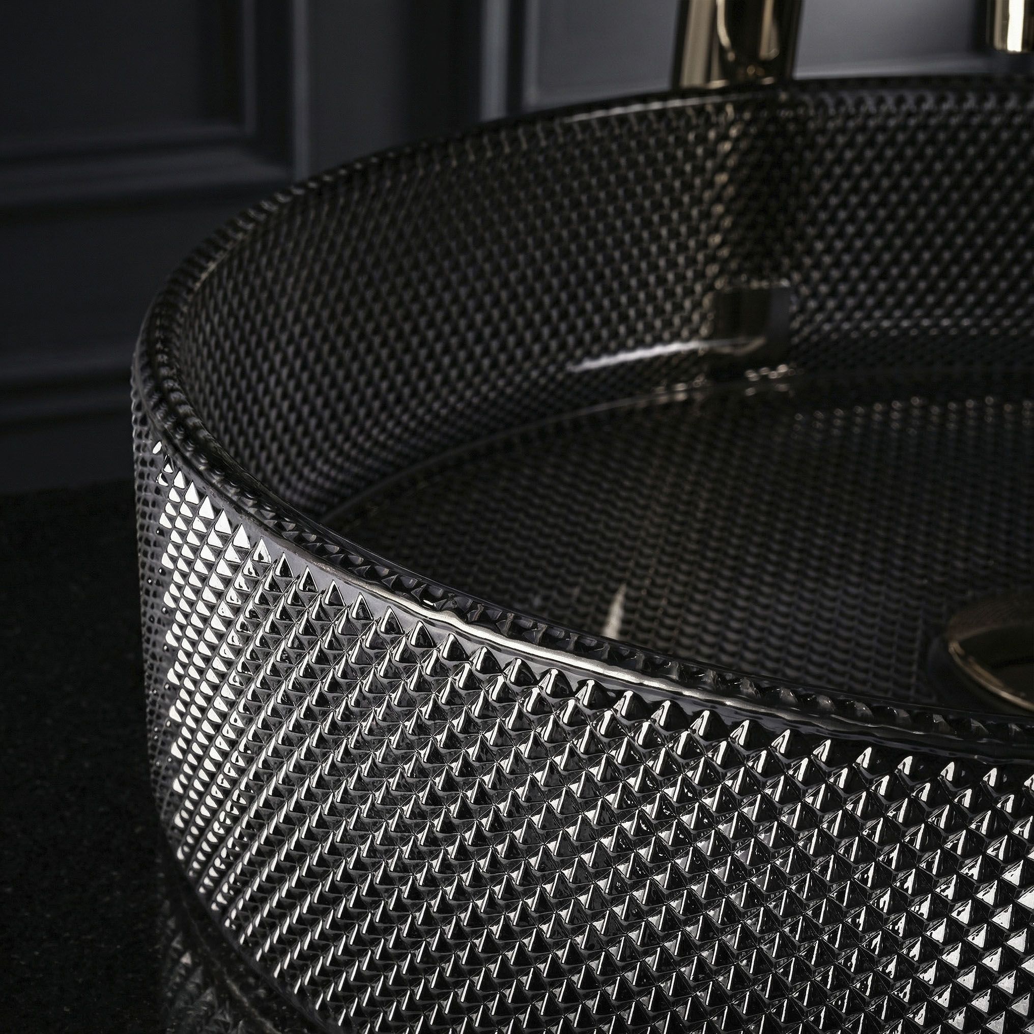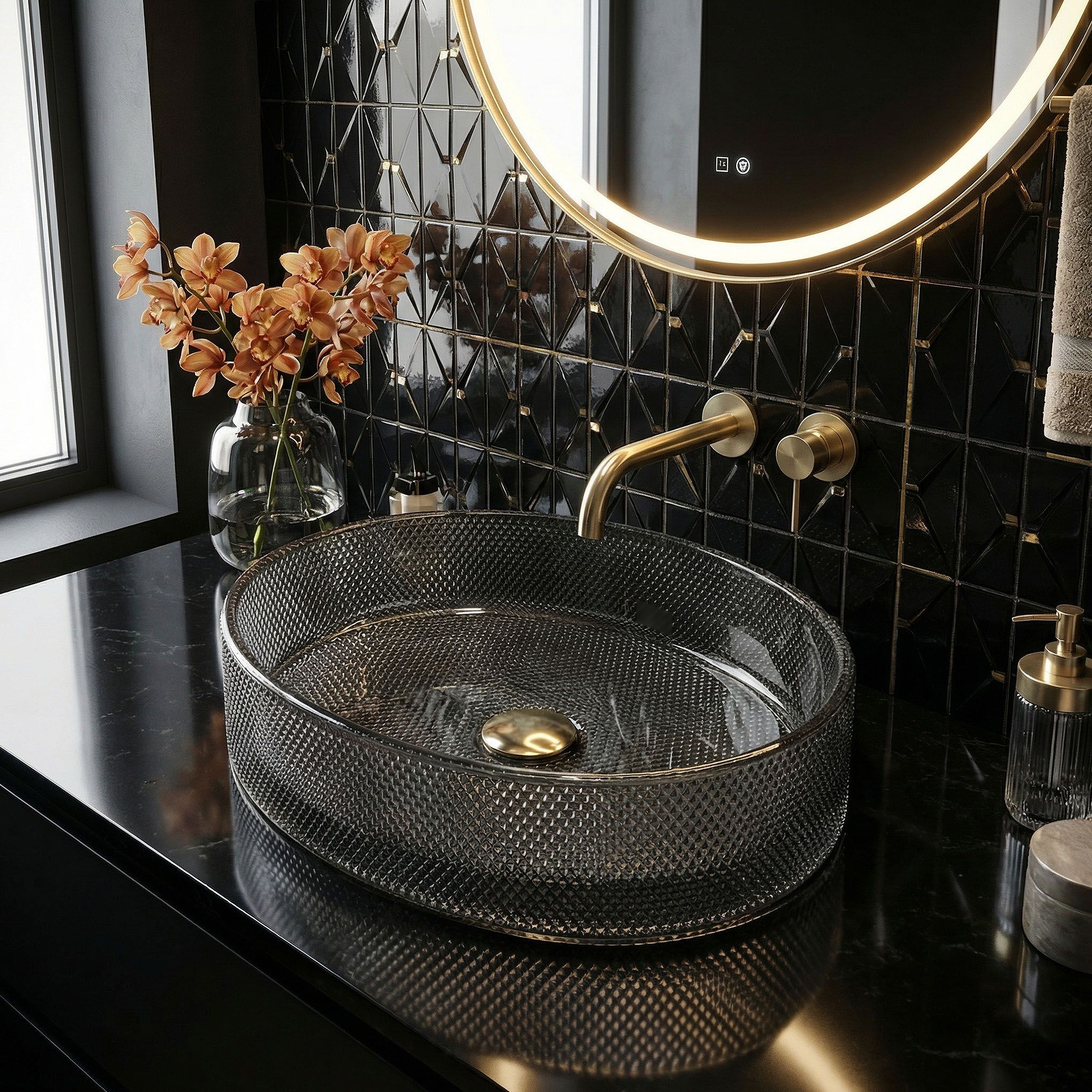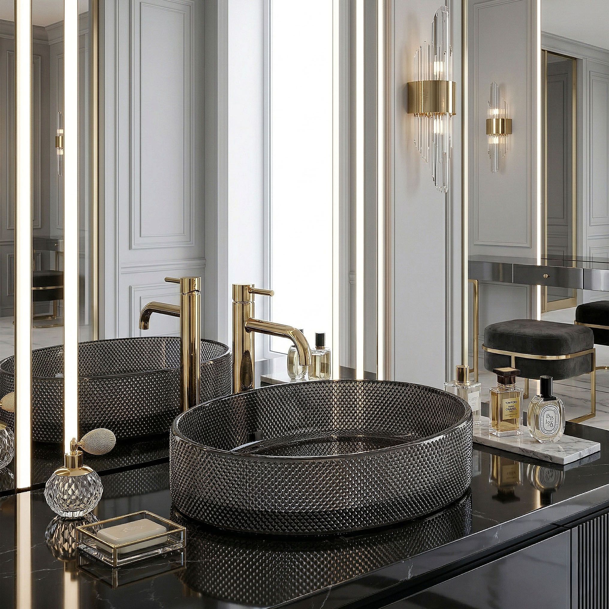 V glamour kúpeľni so zlatými doplnkami, mramorovými obkladmi a zrkadlovými prvkami čierne sklo s fazetovým reliéfom pôsobí ako prirodzené vyvrcholenie celej kompozície. Trblietanie povrchu pri zapnutom osvetlení evokuje atmosféru luxusného hotela.