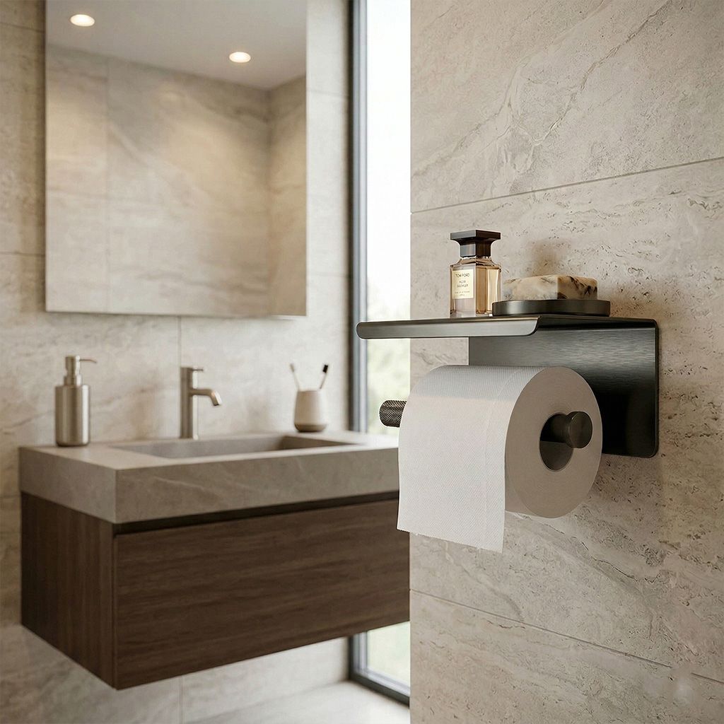 Plochá polička integrovaná do vrchnej časti držiaka poskytuje odkladací priestor priamo tam, kde ho potrebujete. Telefón, vlhčené utierky, malý dezodorant alebo sviečka — polička pojme všetko, čo pri toalete hľadáte v poslednej chvíli.