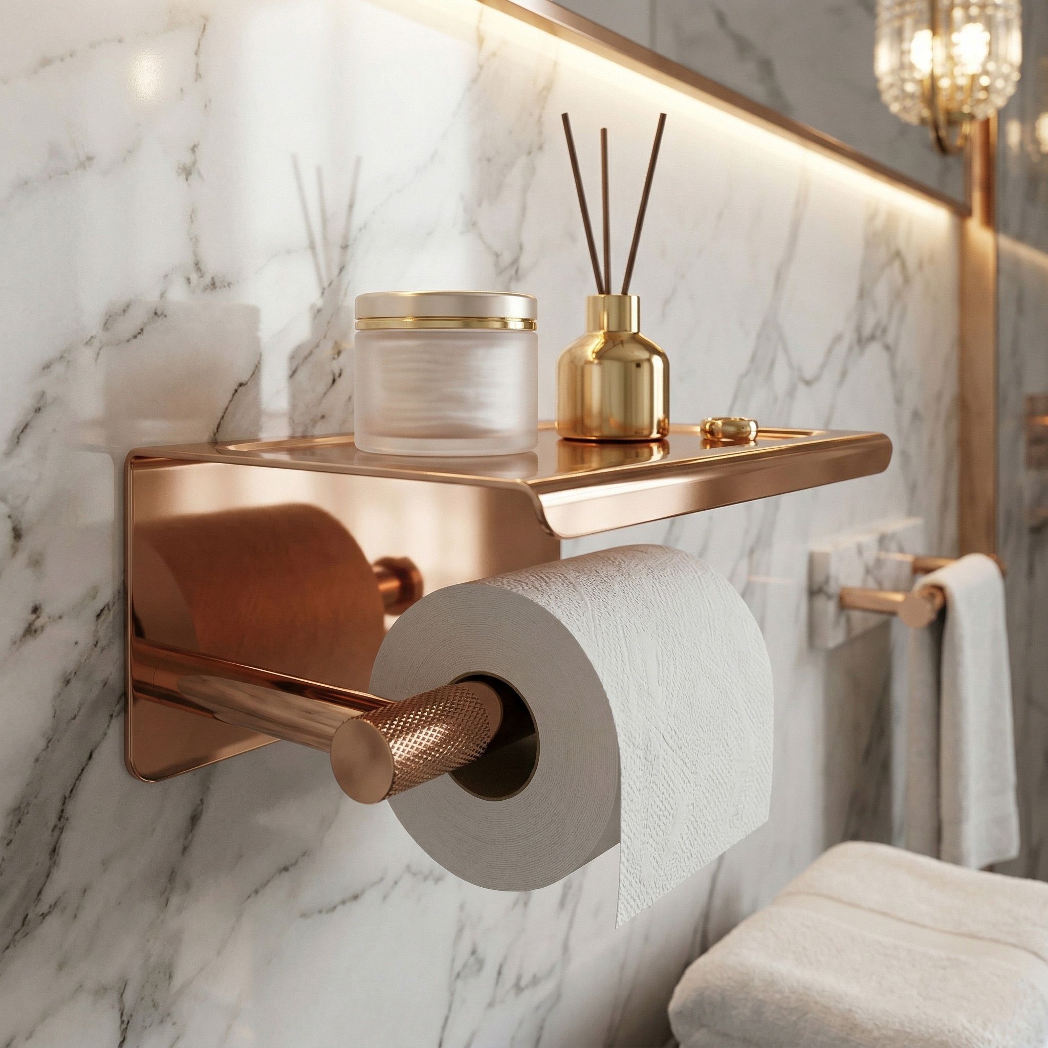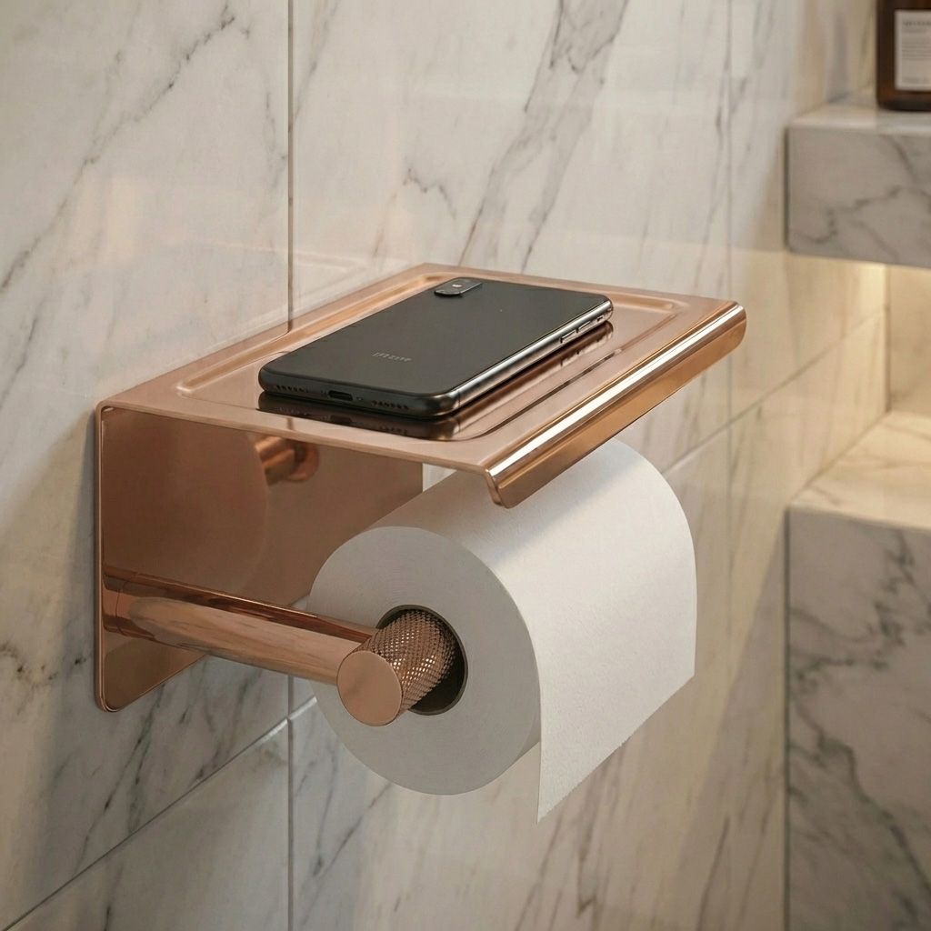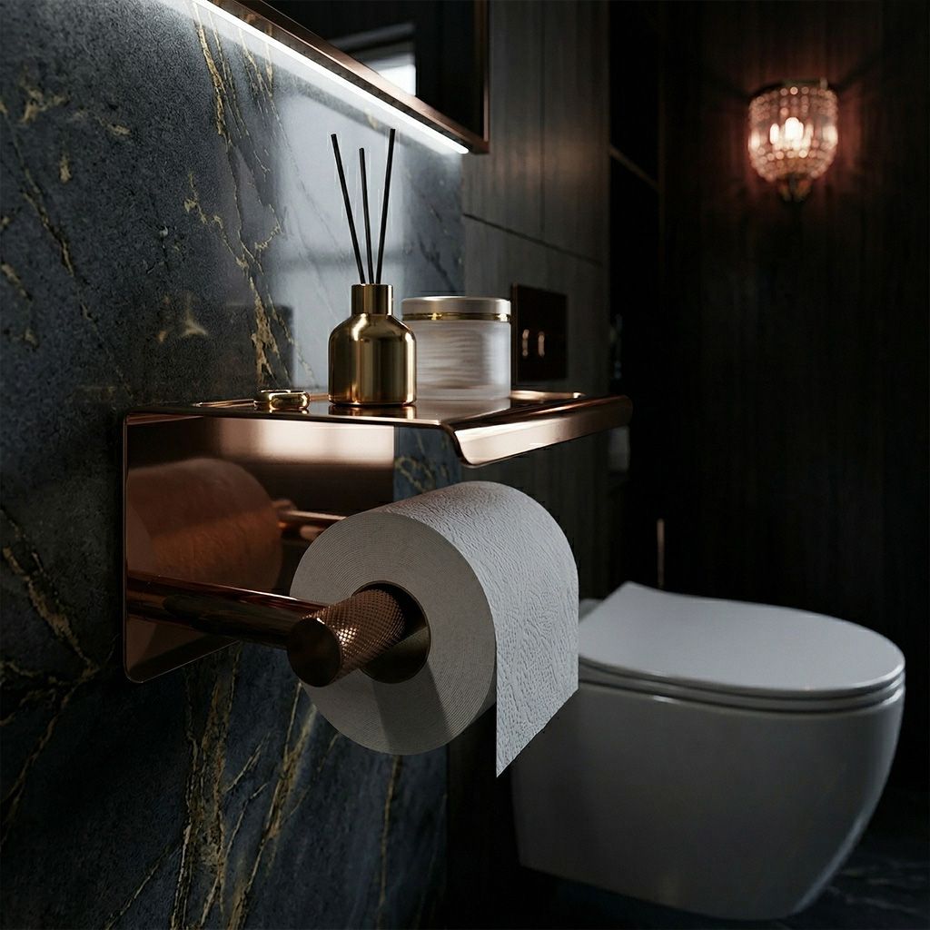 Držiak na toaletný papier s poličkou zo série Modern v medenej farbe je elegantným a praktickým doplnkom, ktorý spája minimalistický štýl s každodennou funkčnosťou. Teplý medený odtieň dodáva kúpeľni luxusný charakter a ladí s modernými armatúrami, archiváciami aj prírodne ladeným interiérom.