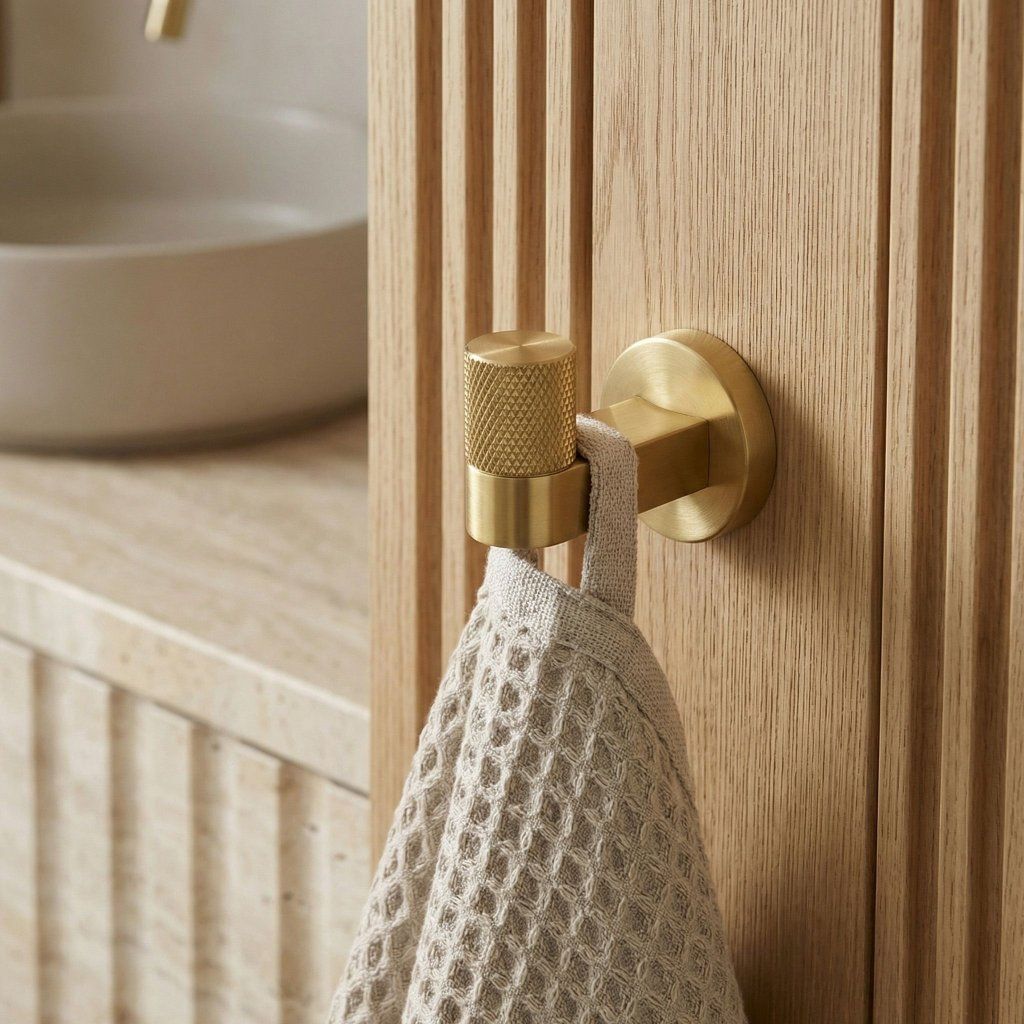 Kúpeľňový háčik zo série Ori v prevedení zlatá matná je šperkovým akcentom, ktorý povýši každú kúpeľňu. Kompaktná forma 35×45×55 mm s vrúbkovaným čelom a teplým matným zlatým odtieňom ladí so všetkými armatúrami série Ori — a vytvára súdržný, premyslený celok so zlatou tematikou interiéru.