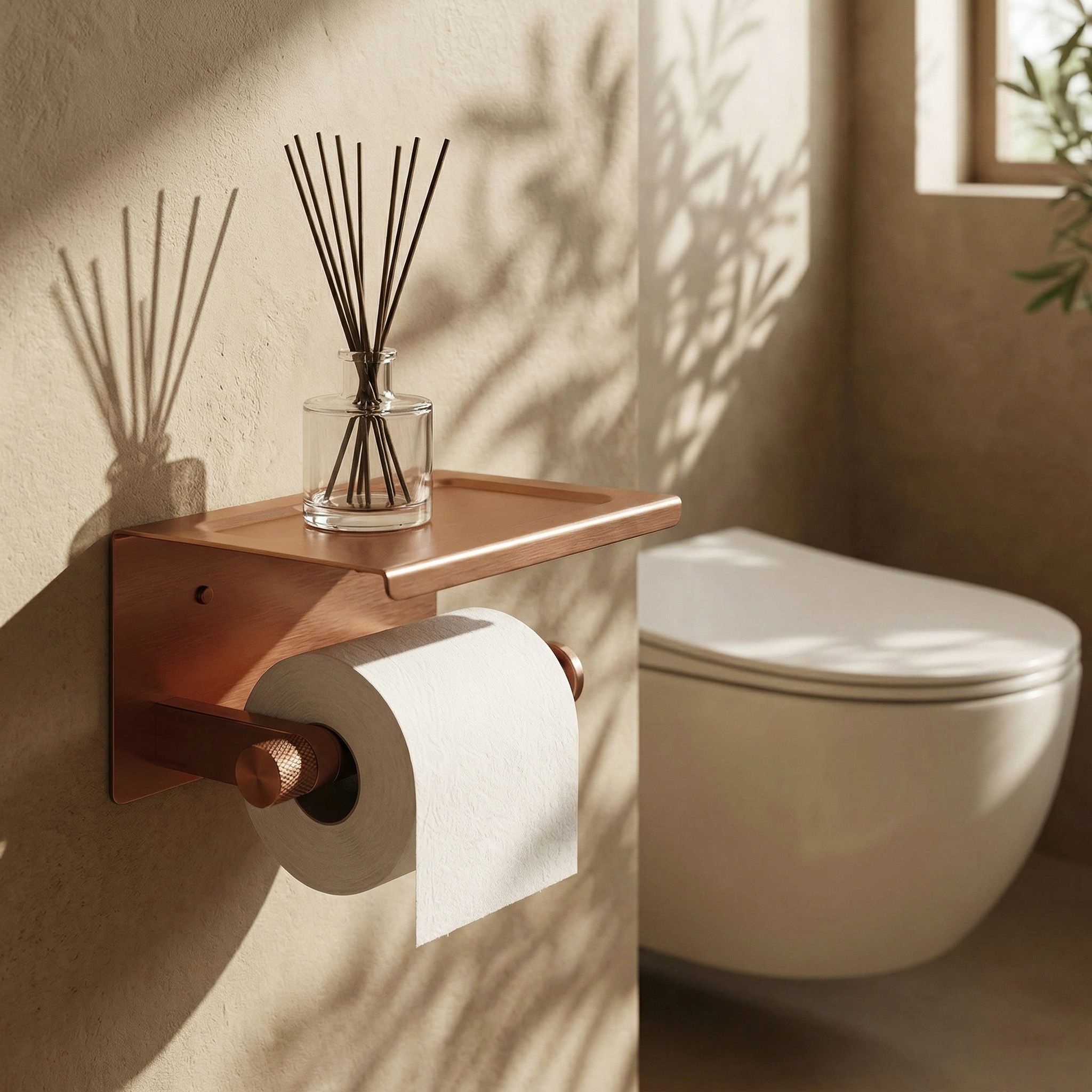 Držiak toaletného papiera s poličkou zo série Ori v medenom matnom prevedení je dôkazom, že aj funkčný doplnok môže byť šperkom kúpeľne. Hlboký teplý odtieň kartáčovanej medi dodáva interiéru elegantný a neotrepaný charakter — a matná štruktúra povrchu zároveň efektívne maskuje bežné stopy každodenného používania.