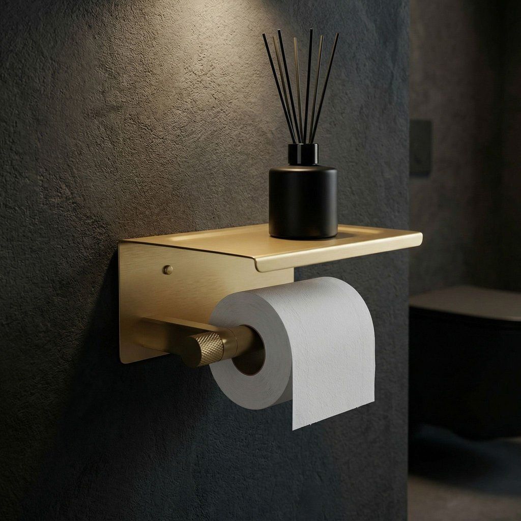 Držiak toaletného papiera s poličkou zo série Ori v prevedení zlatá matná je šperkovým doplnkom, ktorý povýši každú kúpeľňu. Teplý matný zlatý odtieň kartáčovaného povrchu dodáva interiéru prestížny charakter — a zároveň efektívne maskuje bežné stopy každodenného používania, takže doplnok vyzerá čisto bez každodenného leštenia.