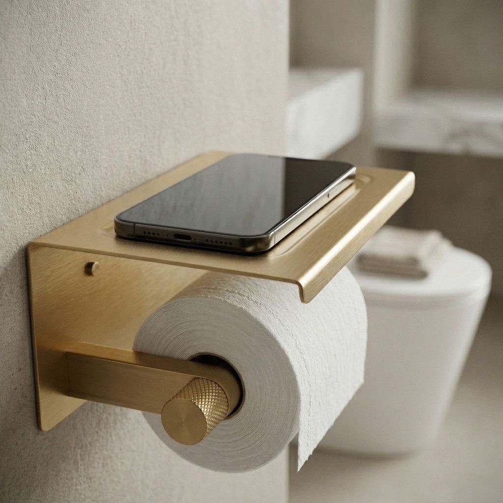 Plochá polička umiestnená priamo nad držiakom rolky poskytuje praktický odkladací priestor bez nutnosti montovať ďalší doplnok. Profilovaná hrana po obvode zabraňuje skĺznutiu predmetov na zem — polička bezpečne udrží telefón, vonné tyčinky, osviežovač vzduchu aj vlhčené obrúsky.