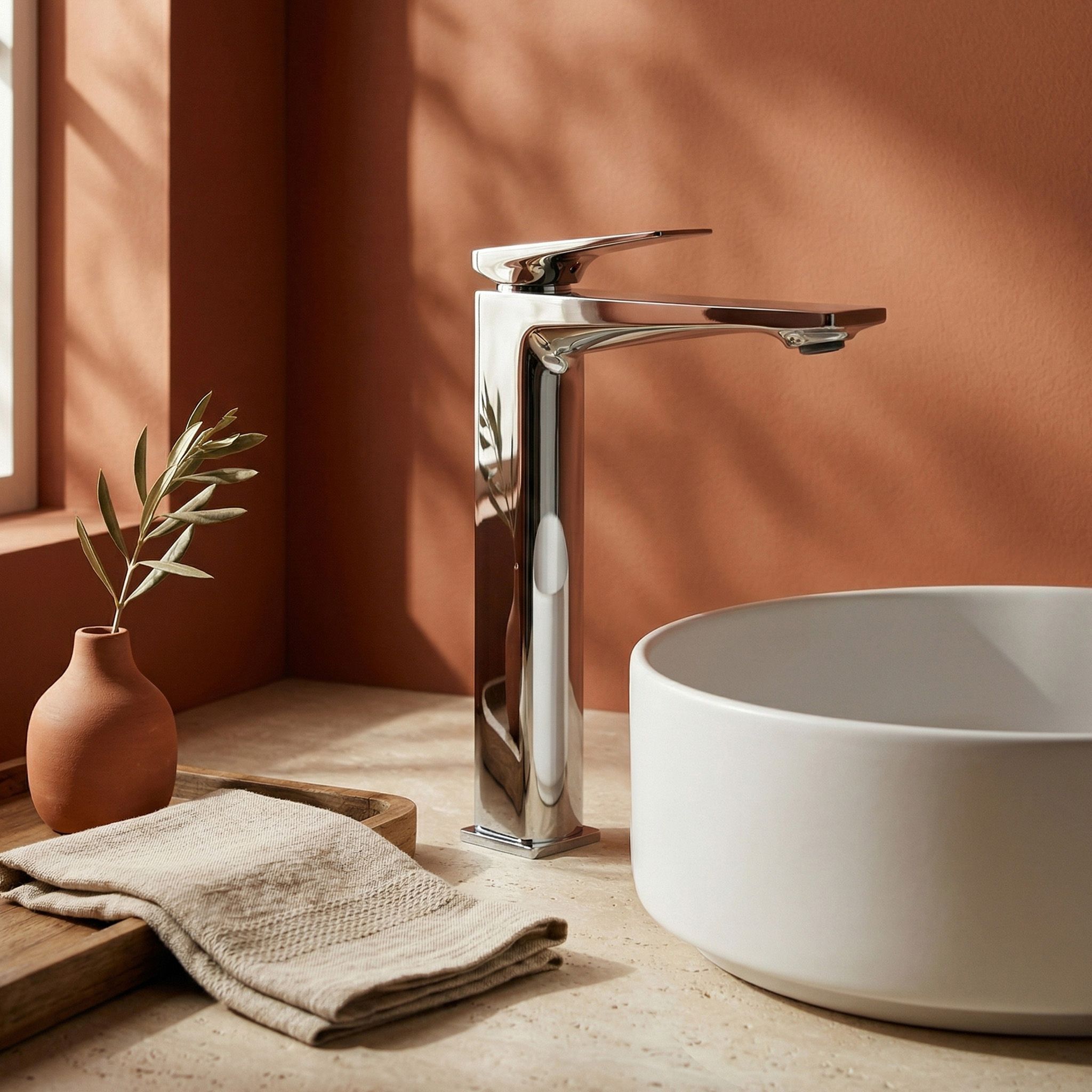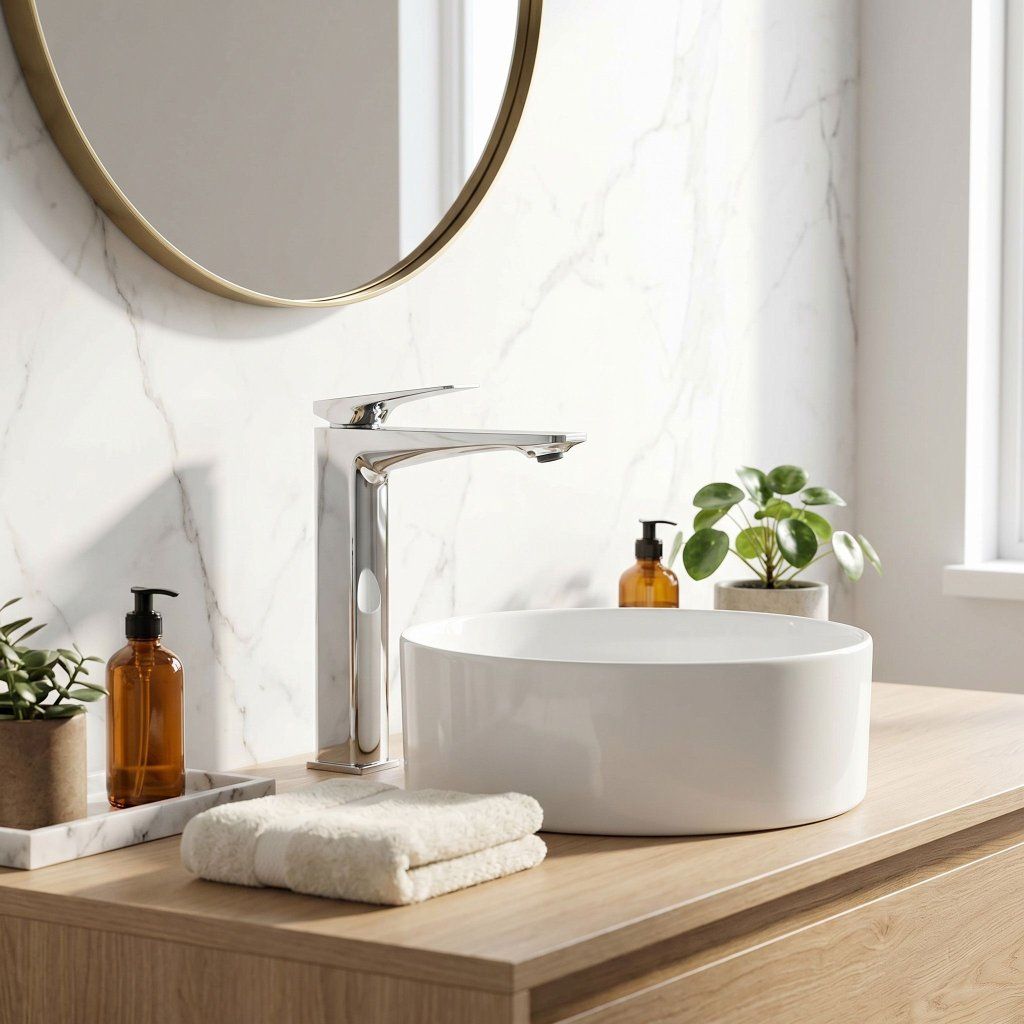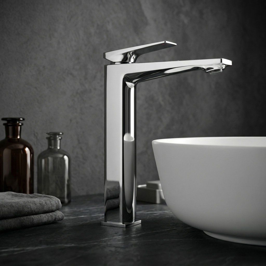Tento dizajn je zámerným protikladom organických tvarov umývadiel na dosku — geometrická batéria a organická kamenná misa vytvárajú napätie, ktoré drží pohromade a robí umývaciu zónu vizuálne zaujímavou. Chróm tento kontrast ešte zvýrazní svojím neutrálnym, zrkadlovým povrchom.