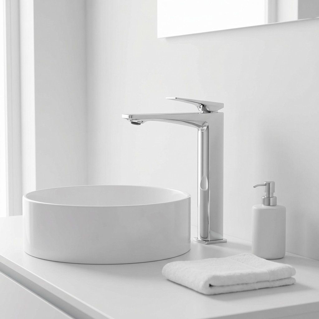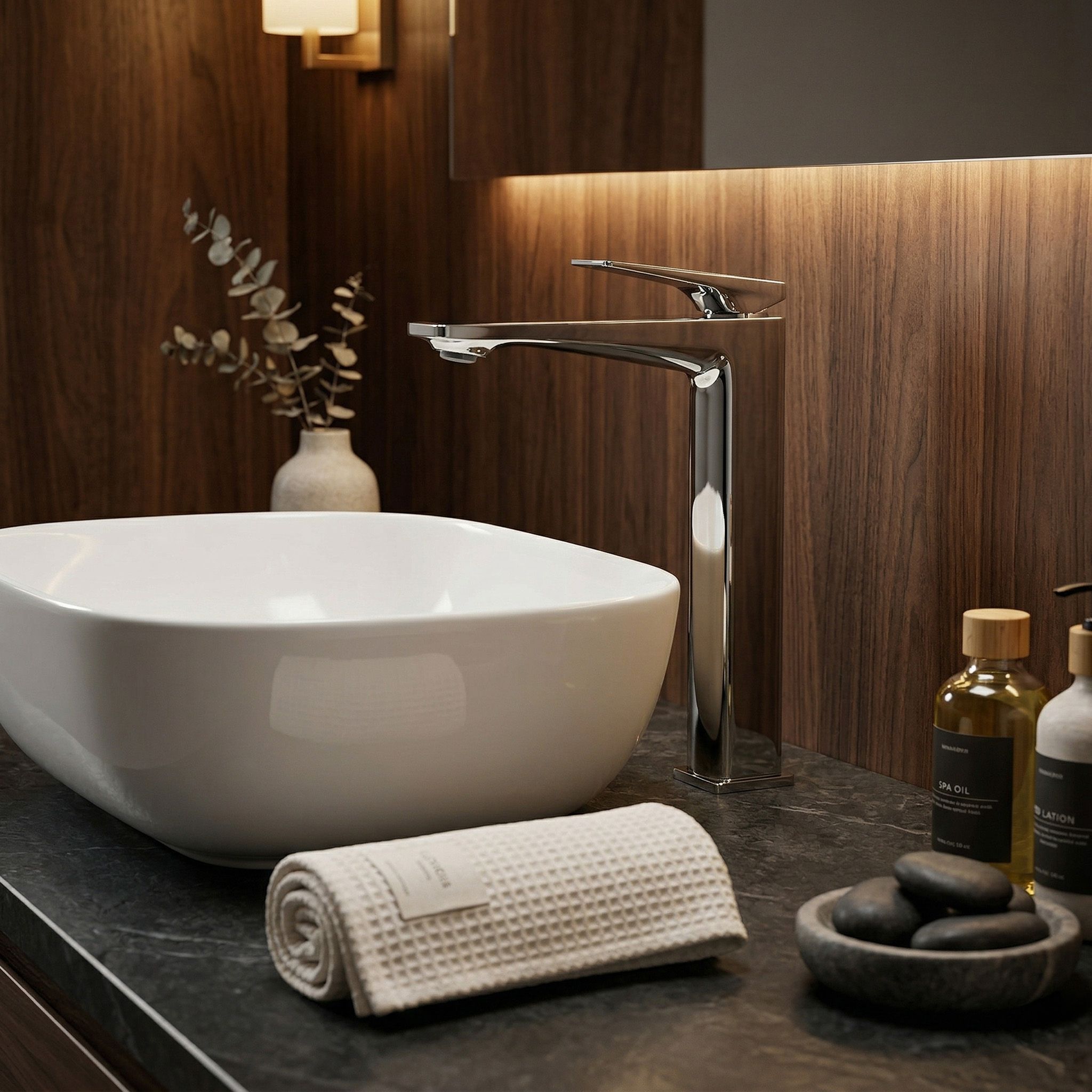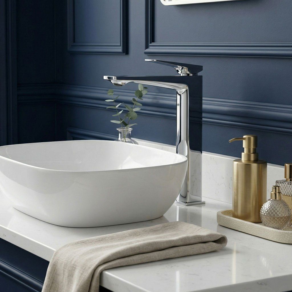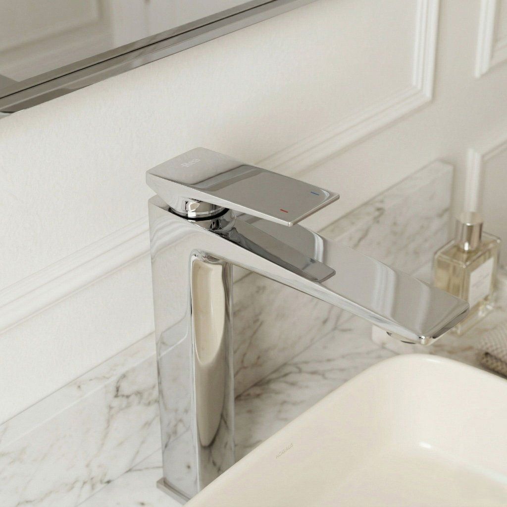 Tento dizajn je zámerným protikladom organických tvarov umývadiel na dosku — geometrická batéria a organická kamenná misa vytvárajú napätie, ktoré drží pohromade a robí umývaciu zónu vizuálne zaujímavou. Chróm tento kontrast ešte zvýrazní svojím neutrálnym, zrkadlovým povrchom.