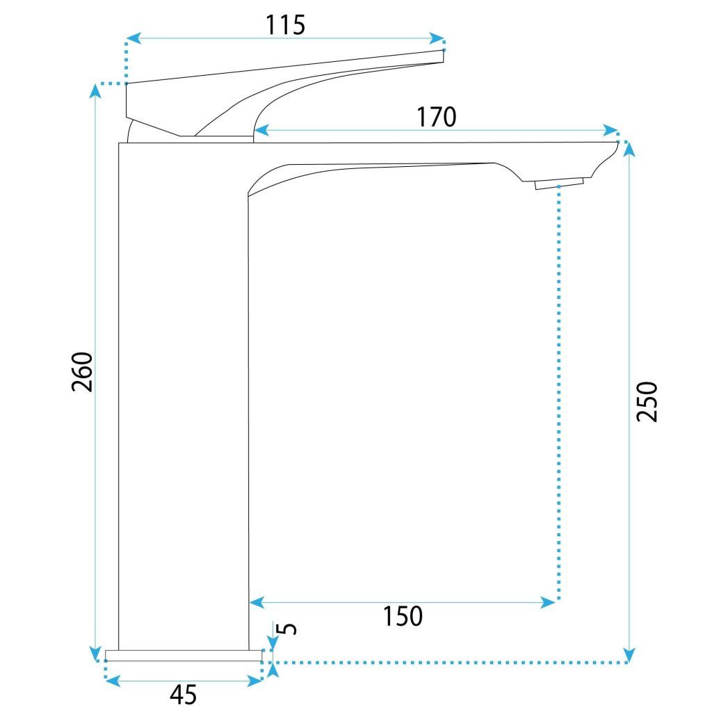 Celková výška 260 mm s dosahom výtoku 150 mm je navrhnutá pre umývadlá na dosku — výtok sa nachádza dostatočne vysoko nad okrajom misy, čo zaručuje pohodlný pracovný priestor bez predkláňania. Montáž je stojanková so závitom 3/8 palca.