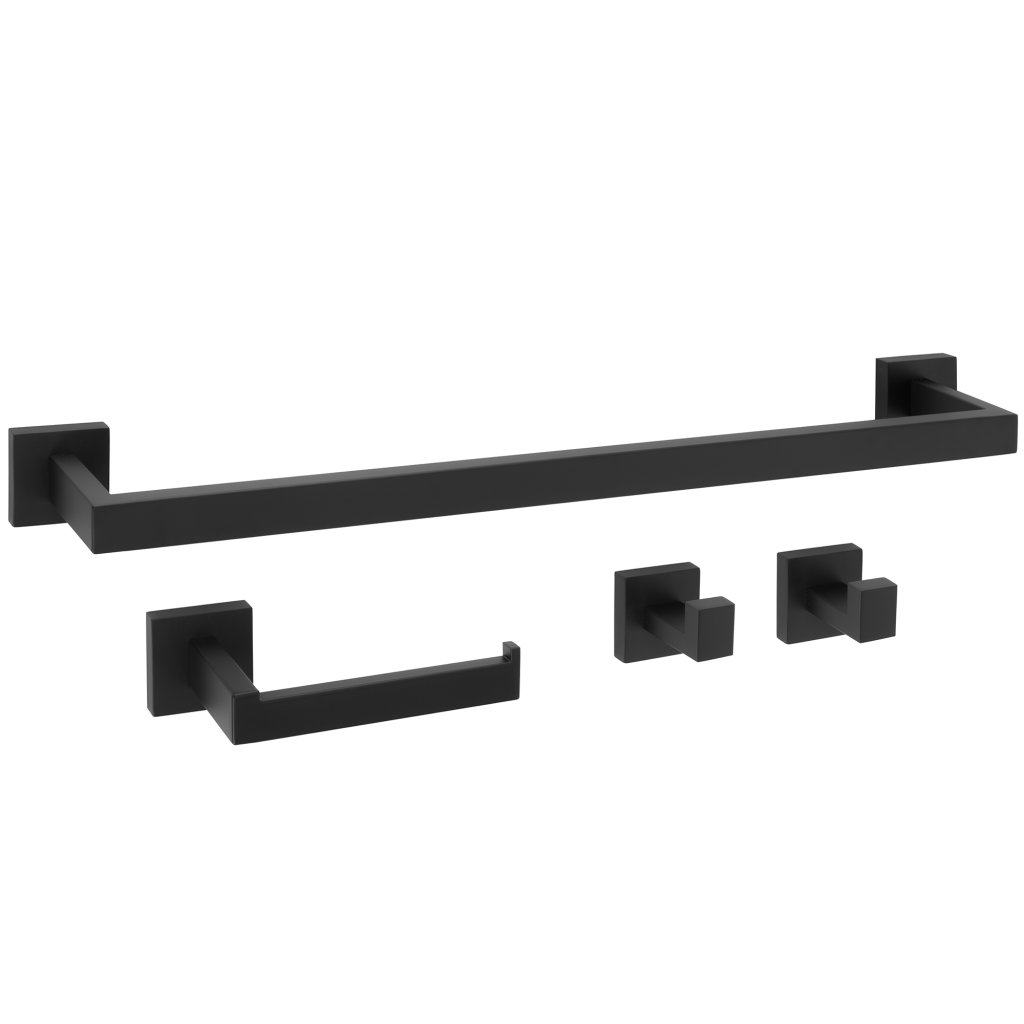 Sada obsahuje všetko potrebné pre praktické a prehľadné usporiadanie kúpeľne: podlhovastý držiak na uterák, držiak na toaletný papier a dva háčiky. Všetky doplnky sú navrhnuté tak, aby tvorili harmonický vizuálny celok.