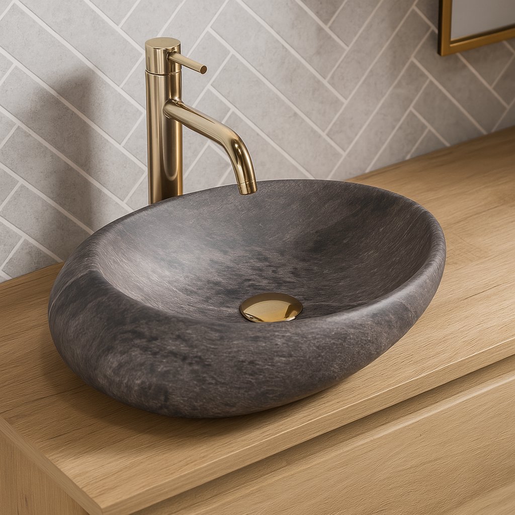 Moderná séria umývadiel z imitácie kameňa. Vďaka technike, ktorou bola vyrobená vrchná vrstva umývadla, má každá položka jedinečný a jedinečný vzor. Tento efekt napodobňuje prírodný kameň. Ergonomický tvar misky umožňuje voľný odtok vody. Umývadlo je možné namontovať na dosku alebo skrinku. Ponúkame perfektné vysoké vodovodné batérie a sifóny v mnohých farbách určené pre toto umývadlo.