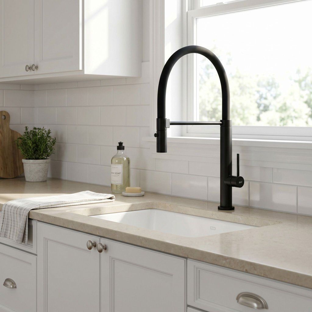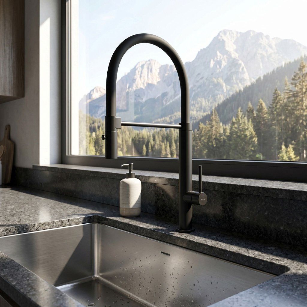 Kuchynska bateria REA Viera v čiernom matnom prevedeníje kvinteseniciou moderného stylu a nekompromisnej funkcnosti. Jej monoliticka, tmava silueta s flexibilnym ramenom idealne zapadá do najnovsich interierovych trendov a tvori dokonalý doplnok kuchyni v loftovom, industrialnom i minimalistickom style.