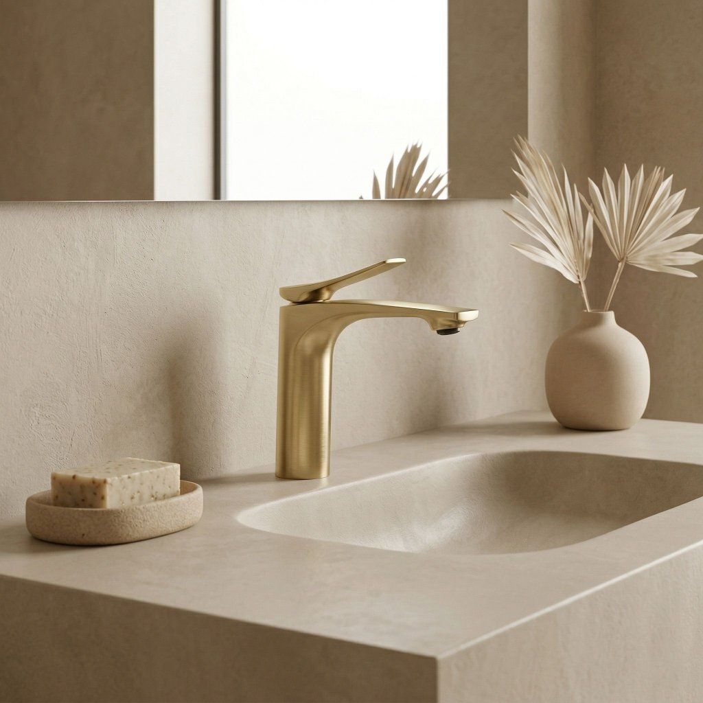 Zlatá matná povrchová úprava série Vision ladí s prírodným kameňom, drevom, bielou sanitárnou keramikou aj tmavými povrchmi — je to teplý kovový odtieň s dostatočnou neutralitou na to, aby sa stal harmonickým súčasťou takmer každého interiérového konceptu kúpeľne. Výborne vynikne pri umývadlách z bieleho mramoru alebo betónu, kde zlaté detaily tvoria decentný luxusný akcent.