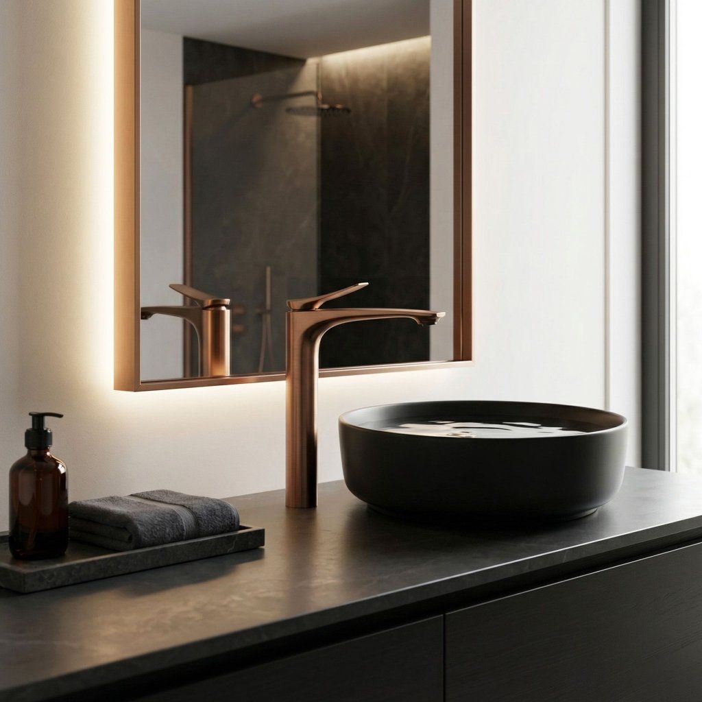 Medený tón je prírodný materiál v zmysle farebnosti — harmonizuje s béžovými a ecru umývadlami z Artificial Stone (Marlo, Saturn, Kallisto, Azalia), s prírodným drevom aj s terakotovými a zemitými obkladmi. Meď v týchto kombináciách nepôsobí ako kov, ale ako organický prírodný akcent.