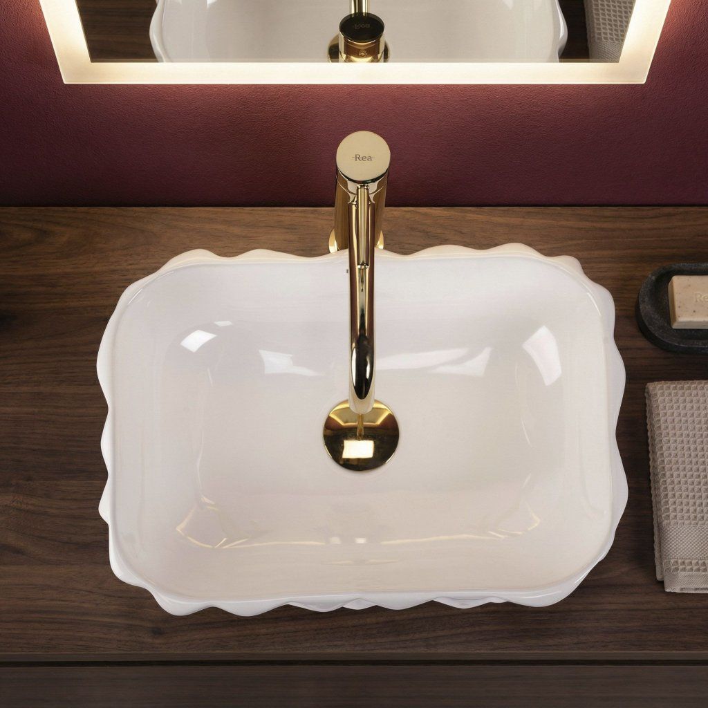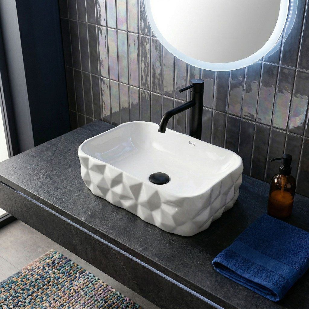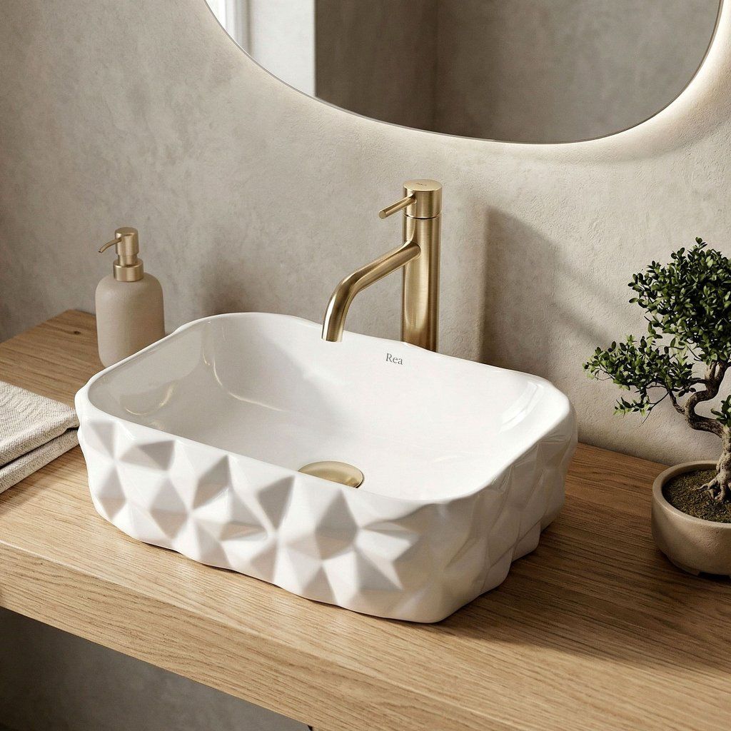 Umývadlo nemá otvor pre batériu ani prepad — batéria sa inštaluje samostatne na stenu alebo dosku vedľa misy. Táto voľnosť dáva priestor na výber armatúry v akomkoľvek štýle a farbe — chróm, matná čierna, zlatá aj medená sú osvedčené kombinácie k bielej lesklej keramike.