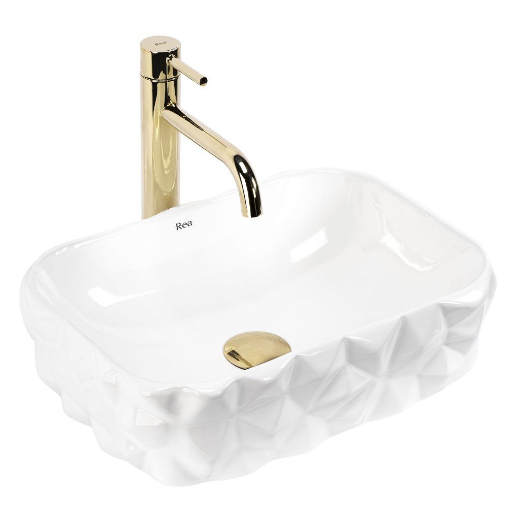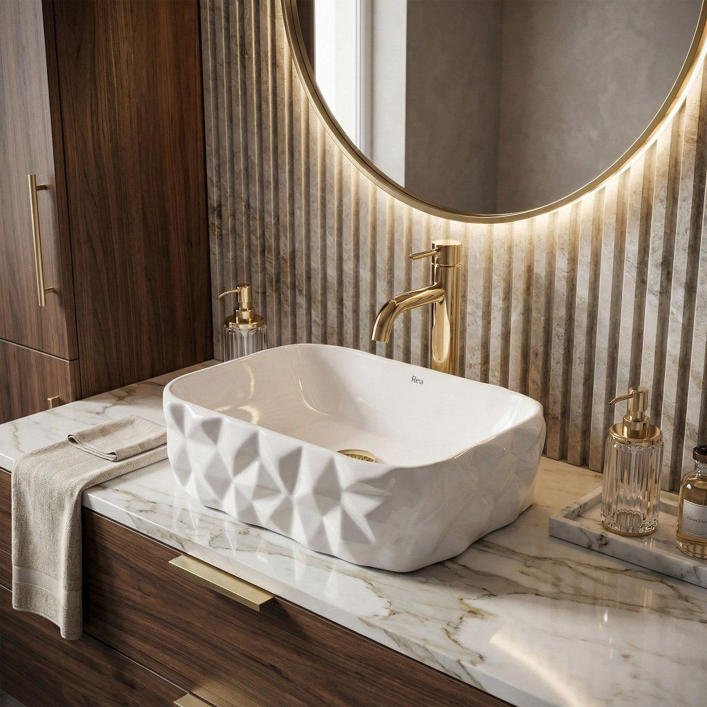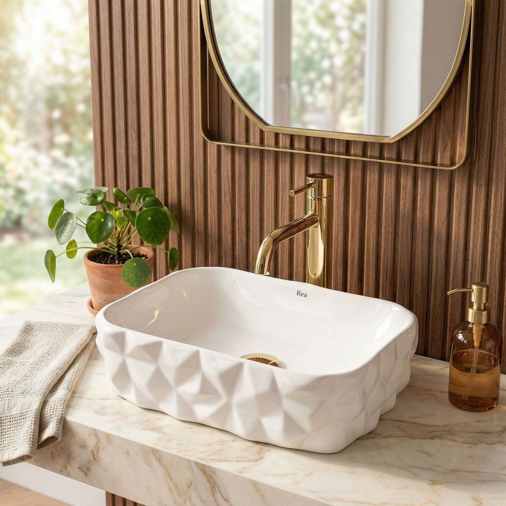 Umývadlo nemá otvor pre batériu ani prepad — batéria sa inštaluje samostatne na stenu alebo dosku vedľa misy. Táto voľnosť dáva priestor na výber armatúry v akomkoľvek štýle a farbe — chróm, matná čierna, zlatá aj medená sú osvedčené kombinácie k bielej lesklej keramike.