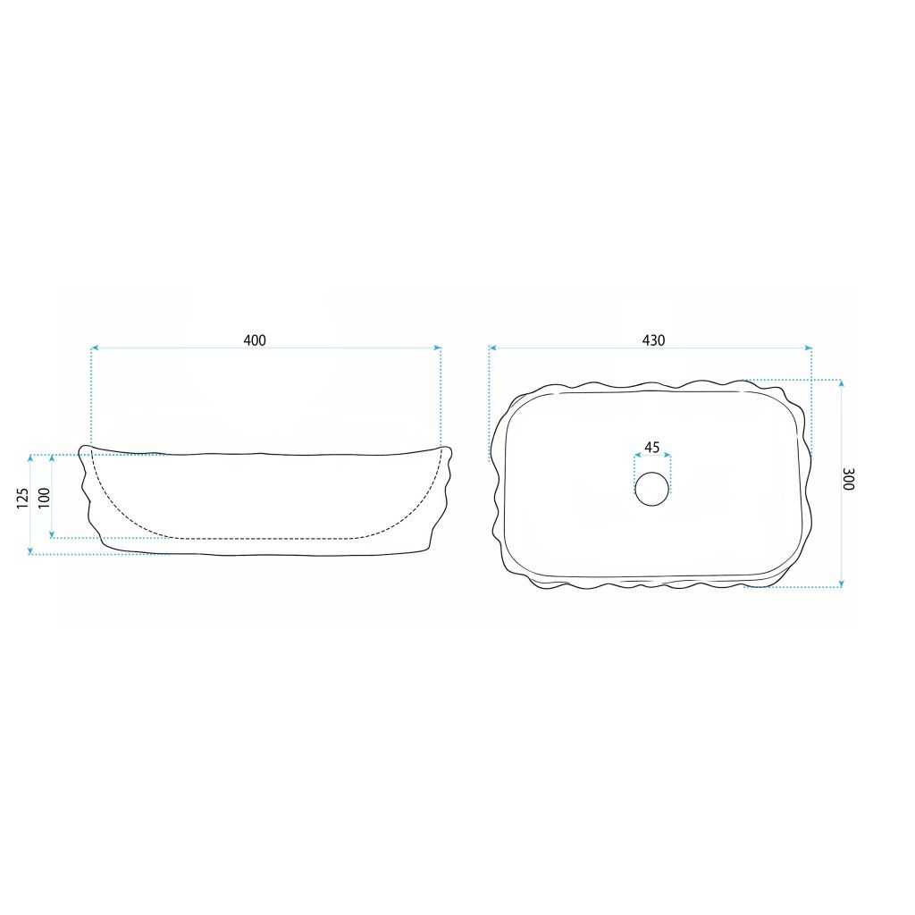 Obdĺžnikový pôdorys 430 × 300 mm s výškou 125 mm a hĺbkou misy 100 mm je kompaktná proporcia, ktorá neplytví miestom na doske skrinky — ideálne riešenie pre menšie kúpeľne alebo toalety, kde chcete silný dizajnový výraz bez veľkého záberu plochy.