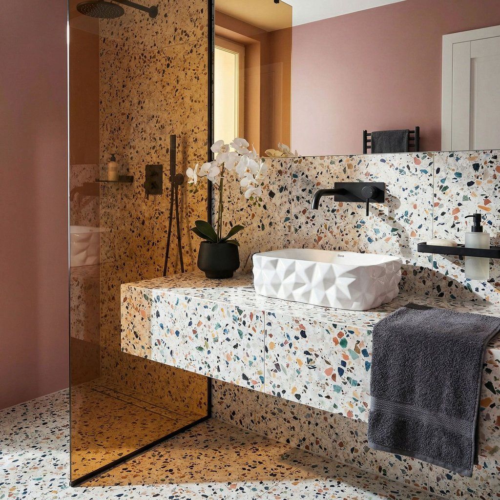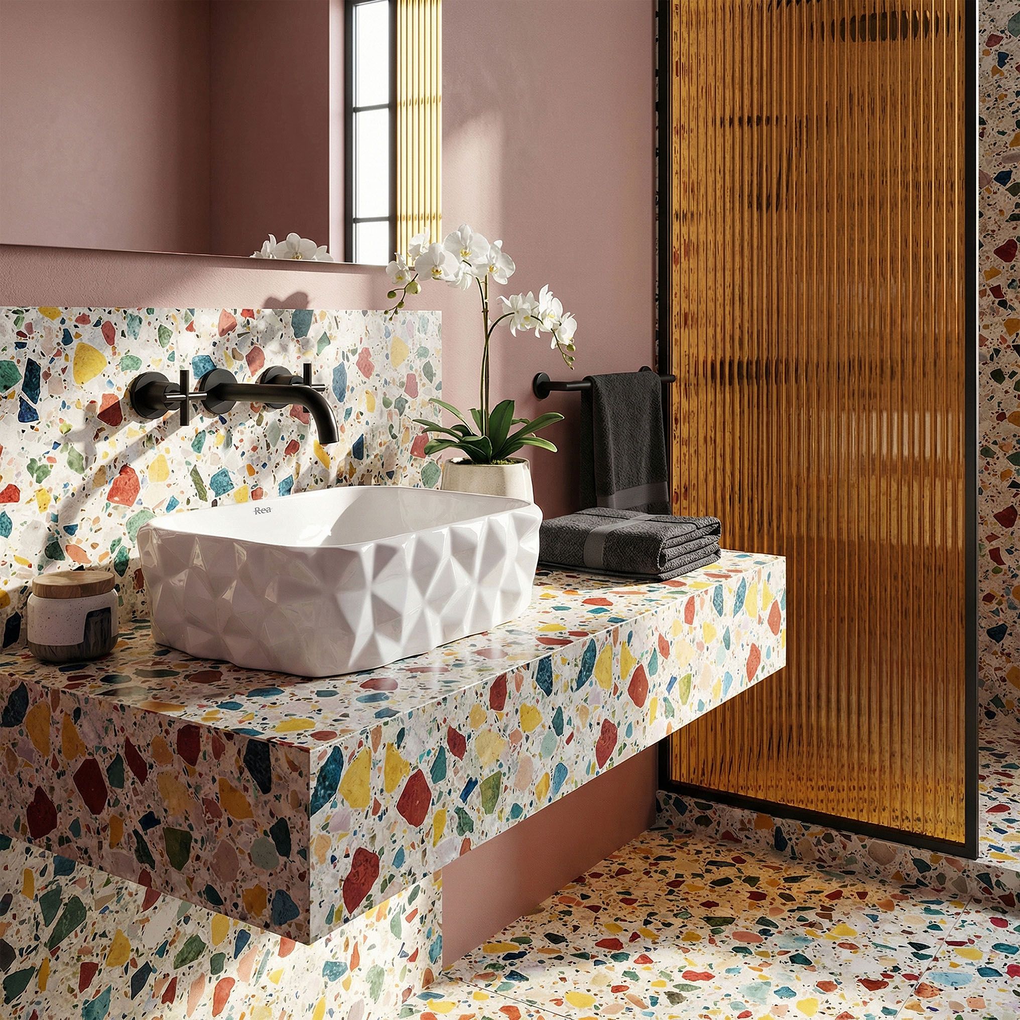 Táto štruktúra posúva Zamiu z kategórie sanitárneho vybavenia do kategórie dekoratívneho objektu — na doske skrinky pôsobí ako zámerná sochárska inštalácia, nie ako funkčný prvok schovaný v rohu kúpeľne.