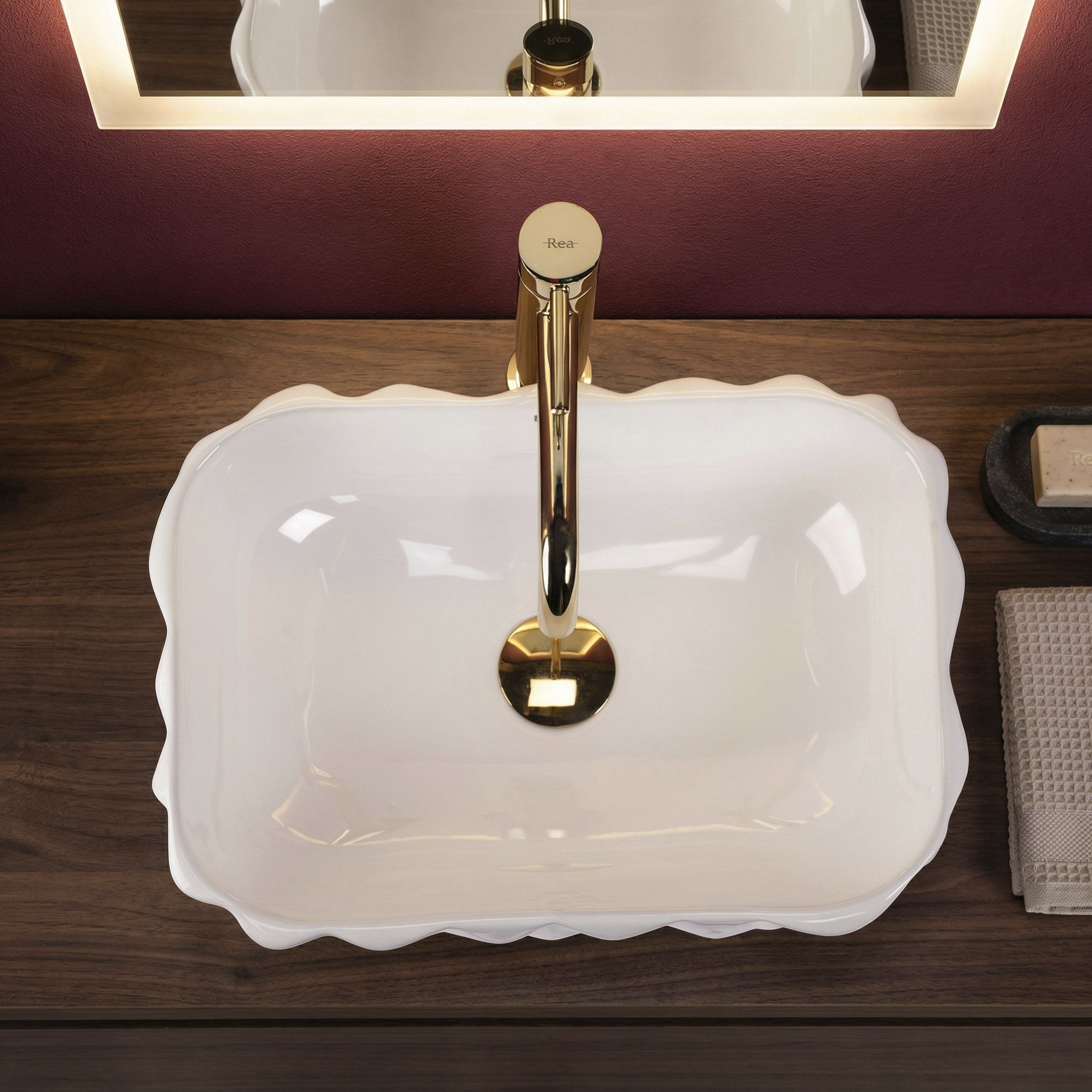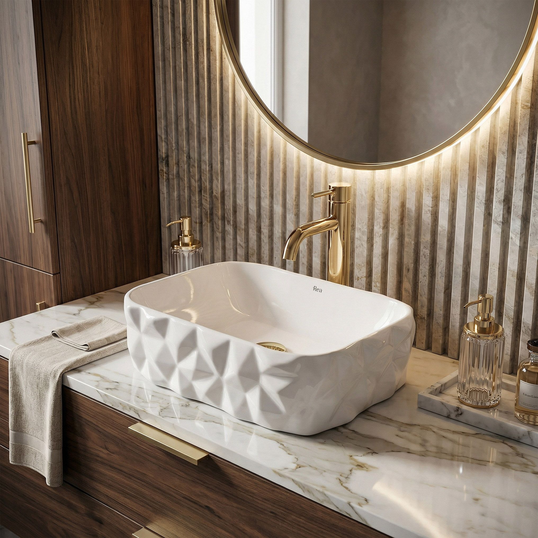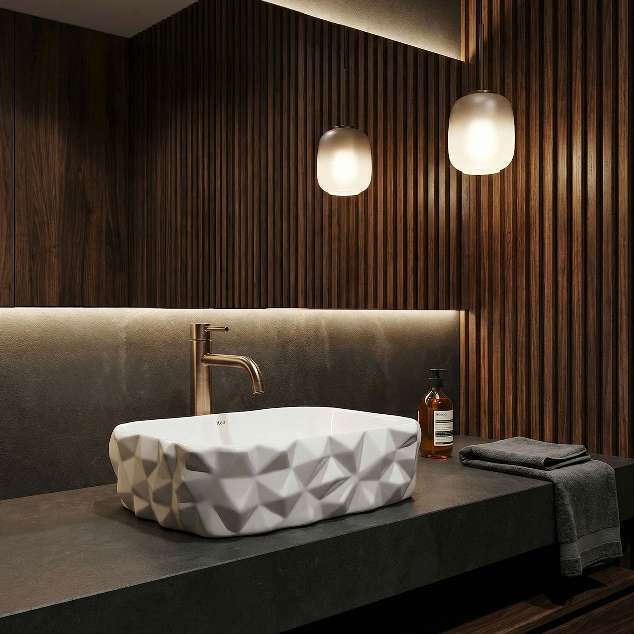 Vonkajší povrch Zamie nie je hladký — geometrická, sochársky poňatá štruktúra vytvára hru plôch a línií, ktorá zachytáva svetlo z rôznych uhlov a mení vizuálny charakter umývadla v závislosti od polohy a intenzity osvetlenia. Každý pohľad odhalí niečo iné.