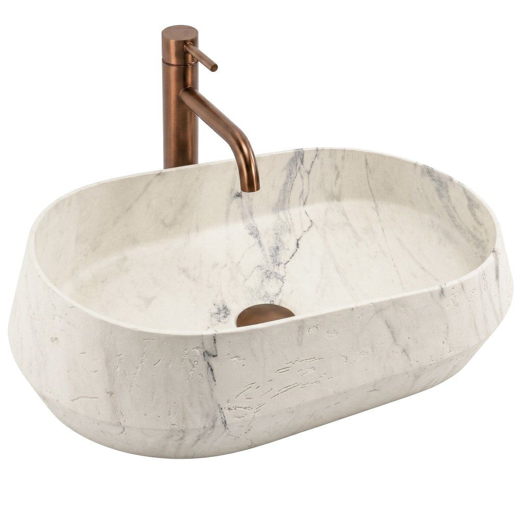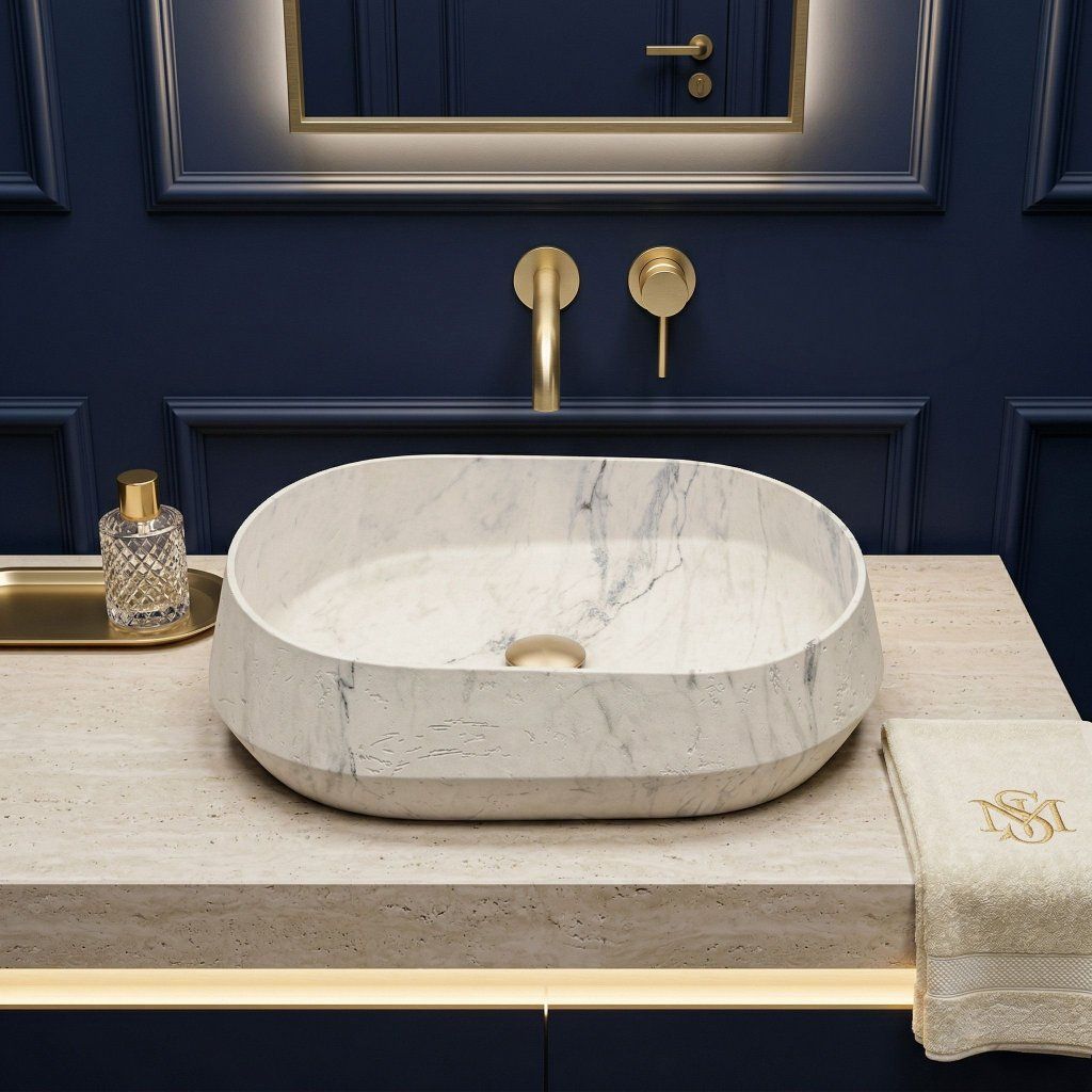 Variant Marlo sa odlišuje od ostatných kamenných variantov jedinečnou farebnosťou — svetlý béžový podklad s jemným teplým nádychom je pretnutý výrazným oceľovo modrým žilkovaním. Táto kombinácia nie je typická pre bežné imitácie mramoru a dodáva umývadlu neobyčajne sofistikovaný, luxusný charakter.