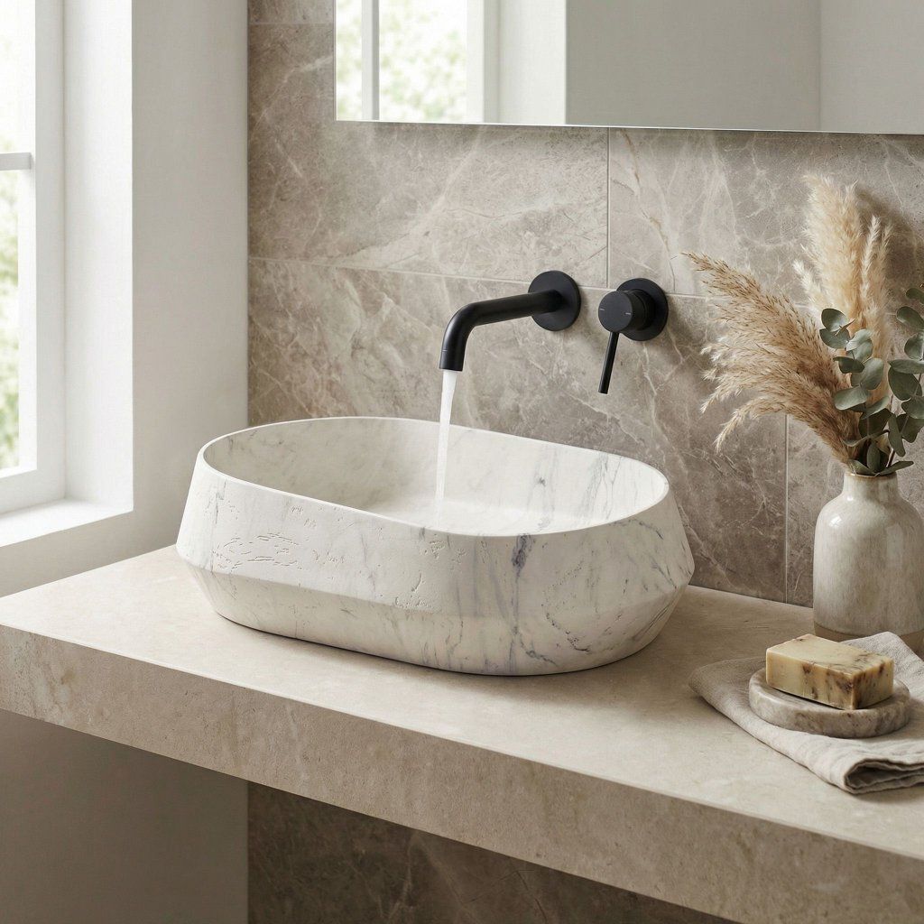 Umývadlo nemá otvor pre batériu ani prepad — batéria sa inštaluje samostatne na stenu alebo dosku vedľa misy. Asymetrická forma prirodzene naznačuje, na ktorú stranu batéria patrí — k širšiemu, „hlavnému" okraju umývadla.